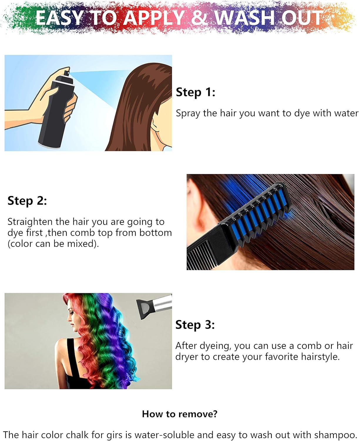 EASY TO APPLY & SAFE – The comb design makes it really easy to dye each hair strand from root to tip. Its creamy formula makes it easy to apply and remove. These chalk colors work well on light brown and blonde hair, but a bit difficult to apply on dark hair.
