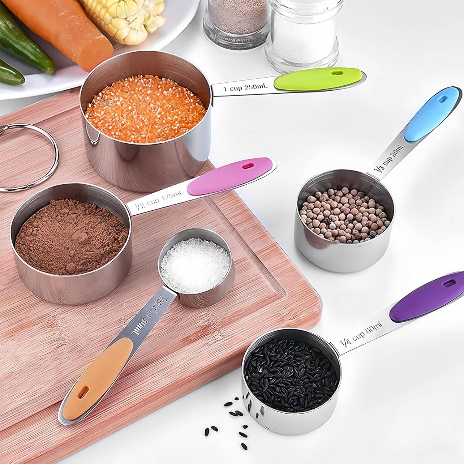 The stainless steel handle is engraved with visible standard metric units to ensure that you are using the correct measurement. There are 8 different sizes of cups to meet your daily needs. 1 cup (236 milliliters), 1/2 cup (118 milliliters), 1/3 cup (78 milliliters), 1/4 cup (59 milliliters), 1 tablespoon (15 milliliters), half tablespoon (7.5 milliliters), 1 tablespoon (5 milliliters), and half tablespoon (2.5 milliliters)