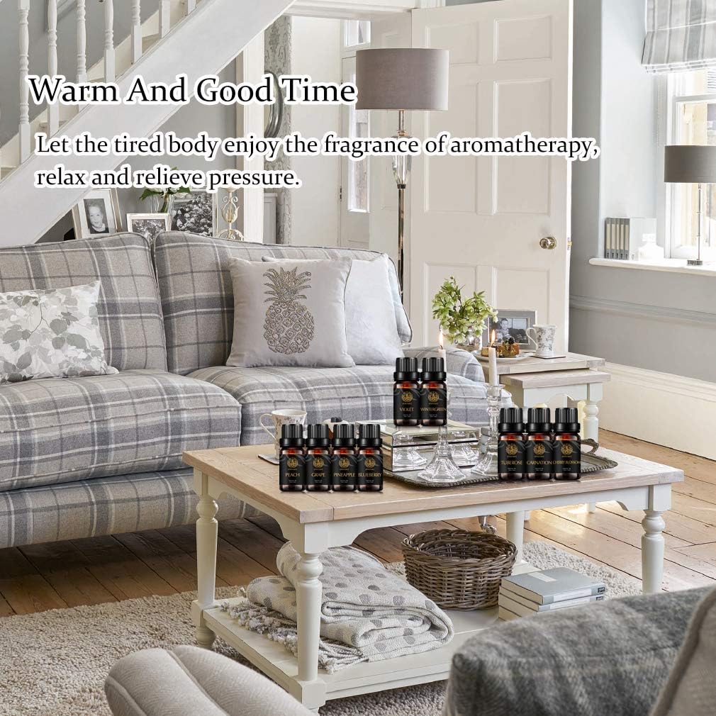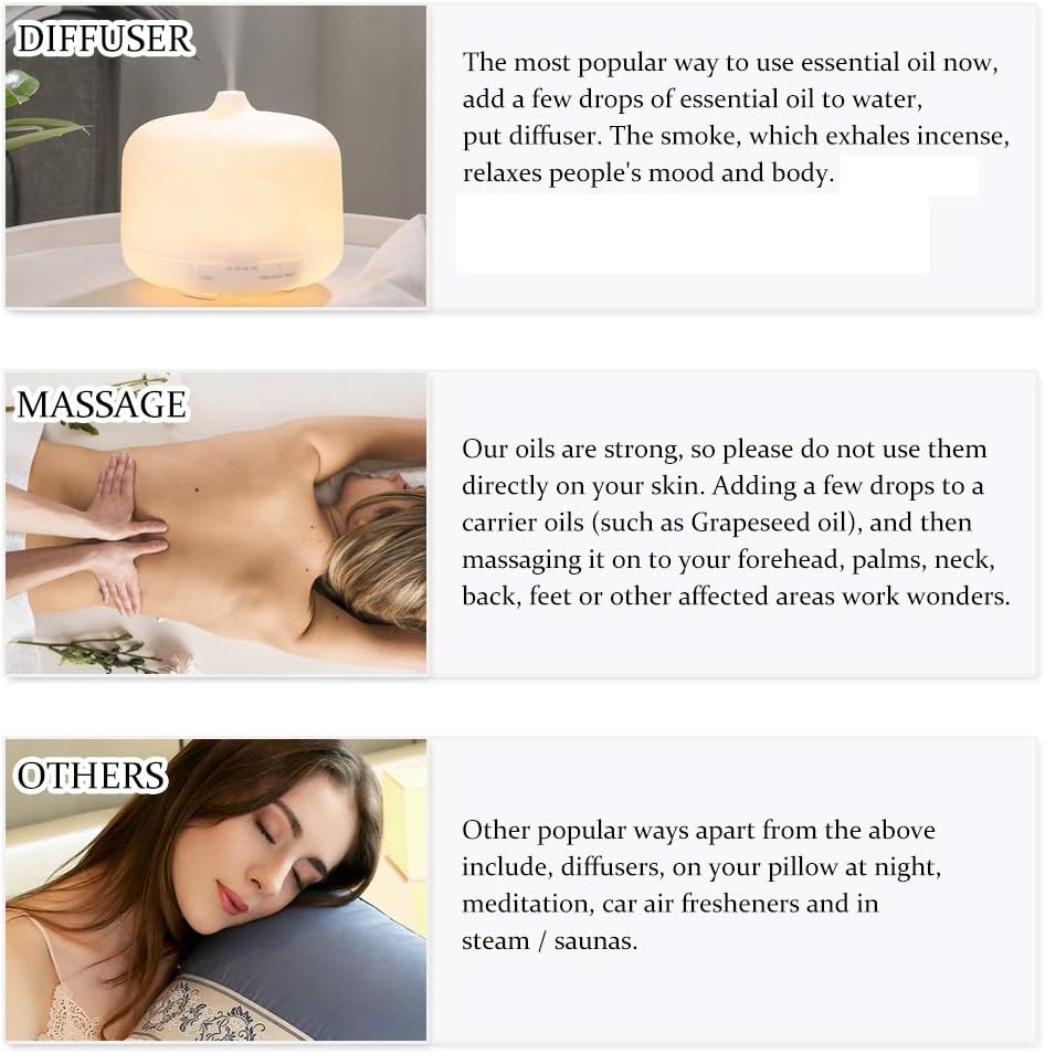 Essential oils are placed in diffuser, sometimes with water, and sometimes with heat so they evaporate. This is a good way to add the scent of an essential oil to a room. Several drops of essential oil are placed on a cotton ball or tissue and allowed to evaporate into the air. If a milder, more constant exposure is desired, simply keep the cotton ball in your immediate vicinity. Drops of essential oil are added to a bowl of steaming water, which quickly vaporizes the oil, breathe deeply. Drops of essential oils are placed in a water-based solution, shaken, and sprayed into the air in order to deodorize a room or set a mood. Drops of essential oils are added to bath water in a dispersant immediately before stepping in. This method results in absorption through the skin, as well as inhalation of the volatilized essential oil. Drops of essential oil are added to a natural carrier oil and applied to skin areas with gentle rubbing. Massage blends should not exceed 1% concentration of essential oils for adults. SAFETY WARNING 【 Package Include 】- Aromatherapy Essential Oil Set contains 20 kinds of Pineapple, Neroli, Wintergreen, Lotus, Calendula, Coffee, Carnation, Blueberry, Marjoram, Peony, Grape, Honeysuckle, Cherry Blossom, Magnolia, Peach, Tuberose, Yougu, Coconut Vanilla, Gardenia, Violet essential Oil. Suitable for your multiple aroma needs at once buying.