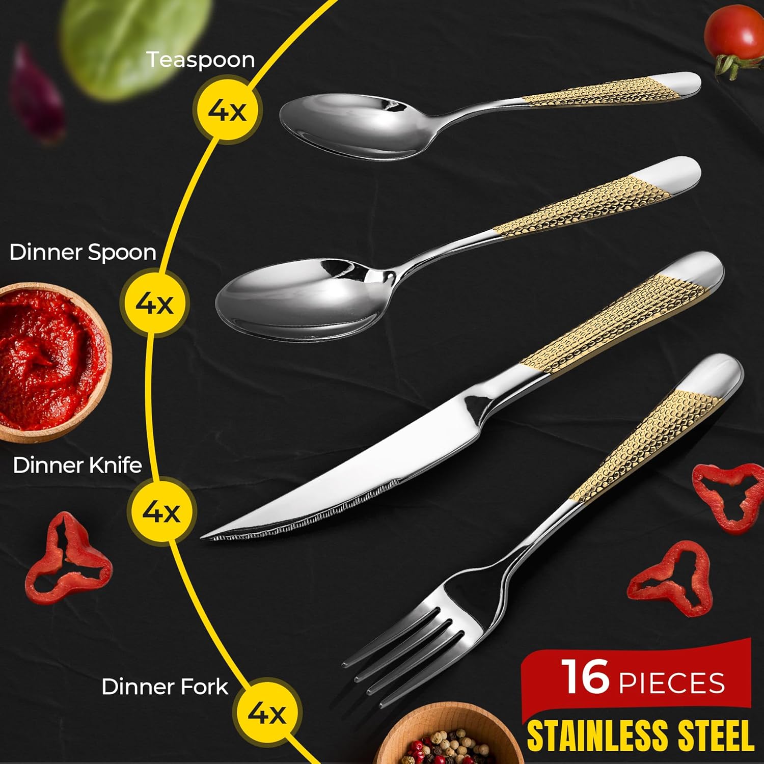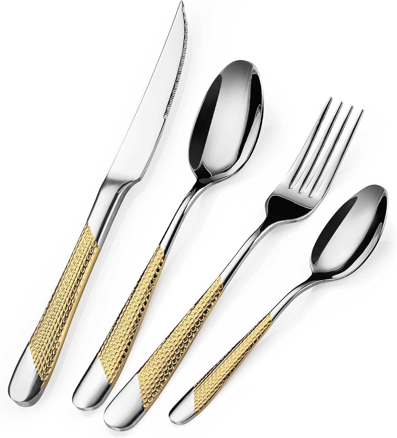 【Silver-Gold Cutlery Set for 4 People】16 piece hammered cutlery set includes 4 dinner knives(23.3cm), 4 dinner forks(20.5), 4 dinner spoons(20.3cm) and 4 teaspoons(17cm). The teaspoon is larger than normal. Please confirm whether the size of the tableware is suitable before purchasing. A complete set of tableware meets your dining needs. Silver hammer design looks luxurious and elegant for any occasion.