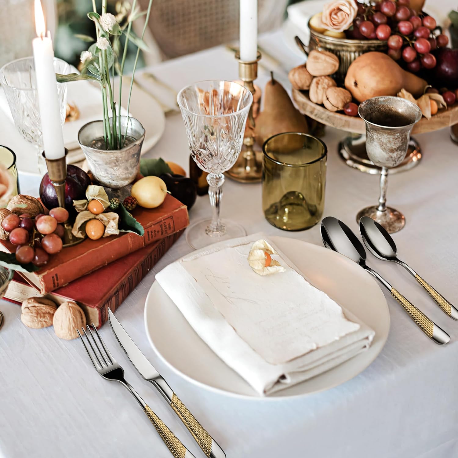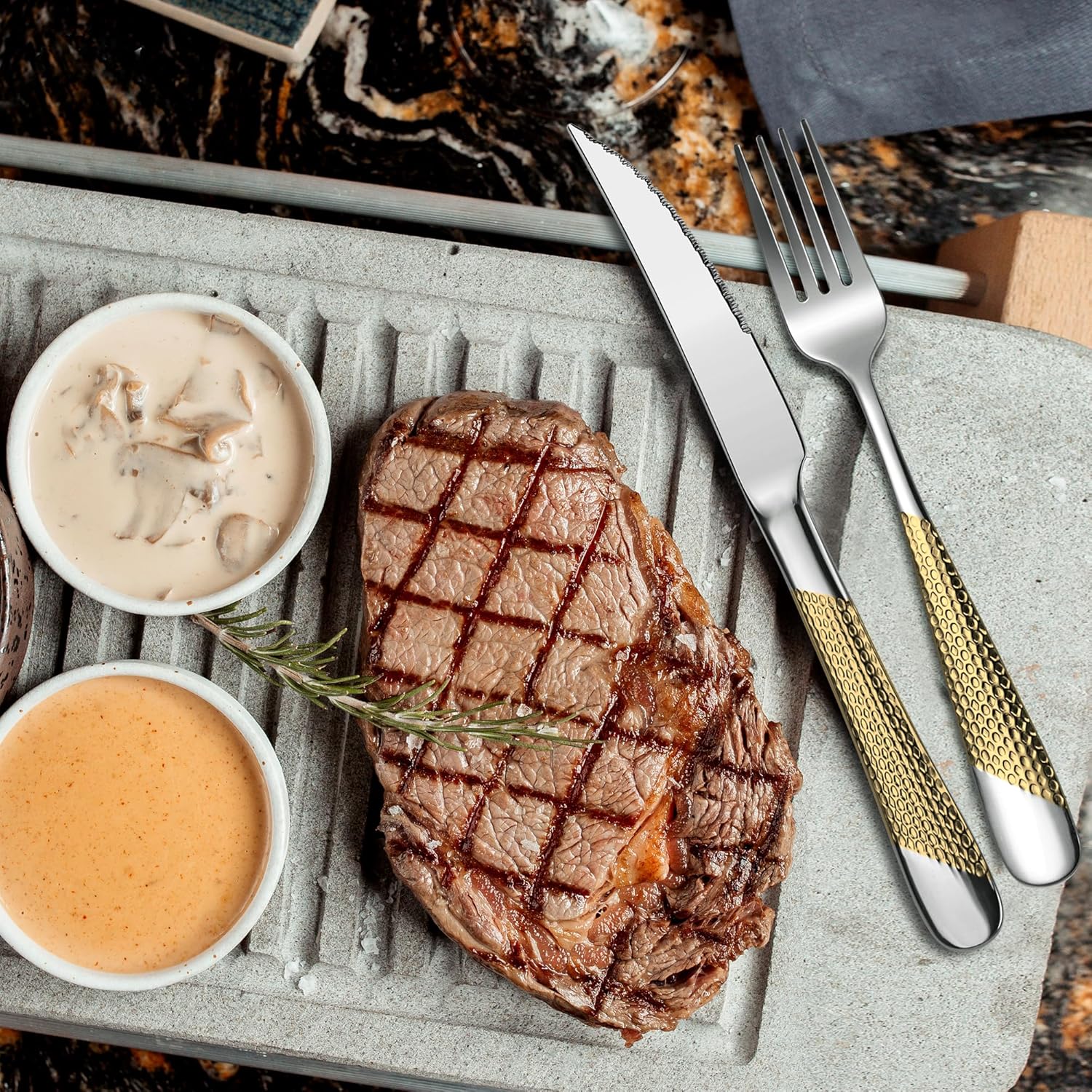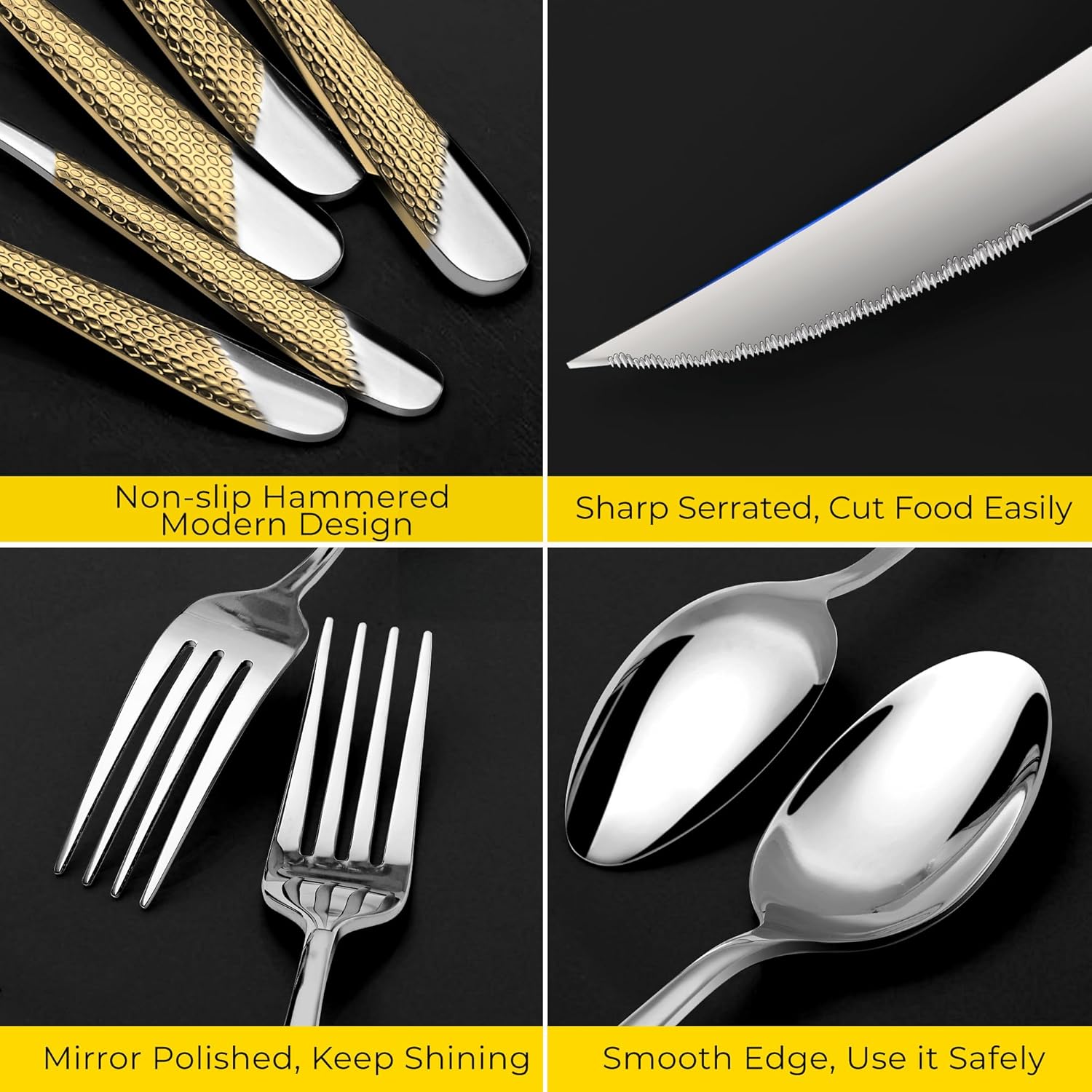 【Hammered Pattern Design】Classic & fashion hammered design can decorate your dining table and kitchen perfectly. The anti-slip function of the hammer grain handle can provide greater grip, preventing the tableware from slipping from your hands.