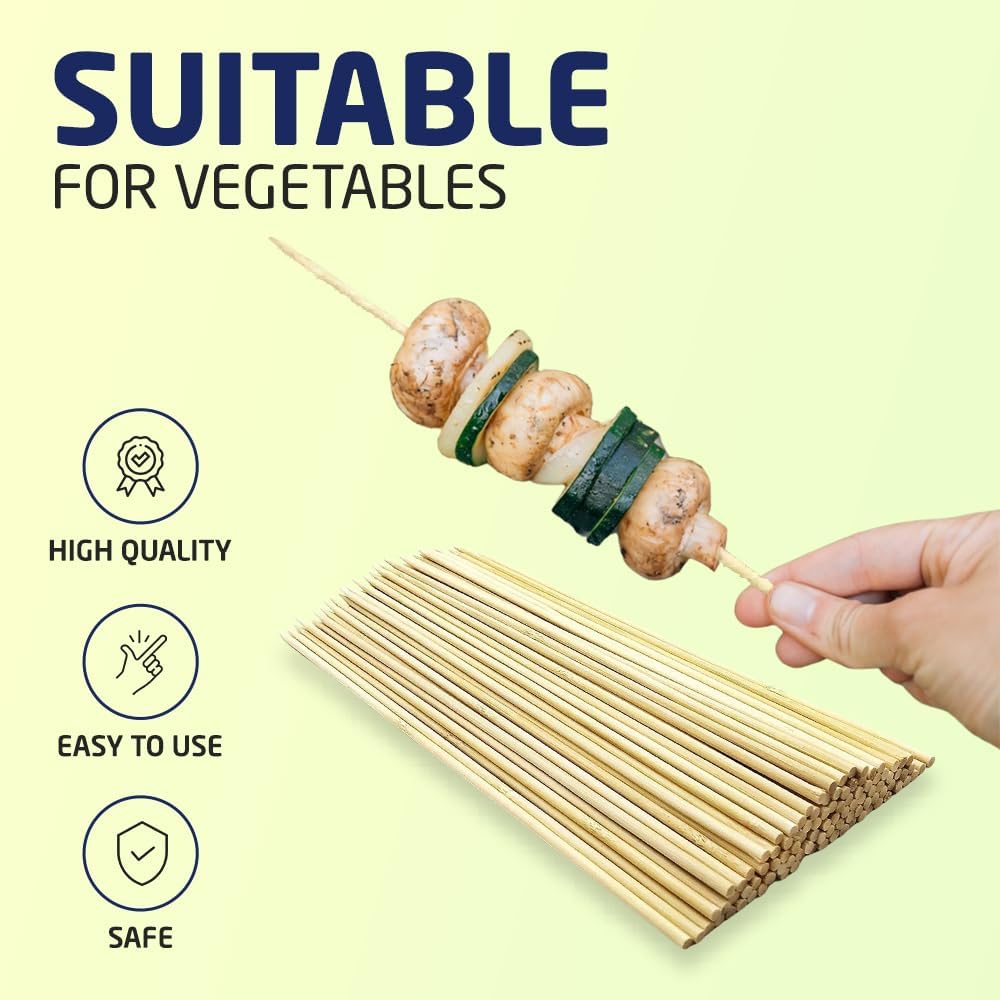For best results Recommend soaking in water for 10 minutes before use. DIMENSIONS: Long, Thick, and Round. Bamboo skewer Dimensions: 10 inches