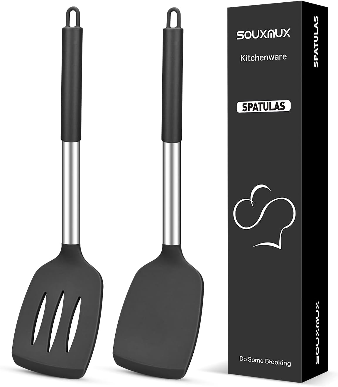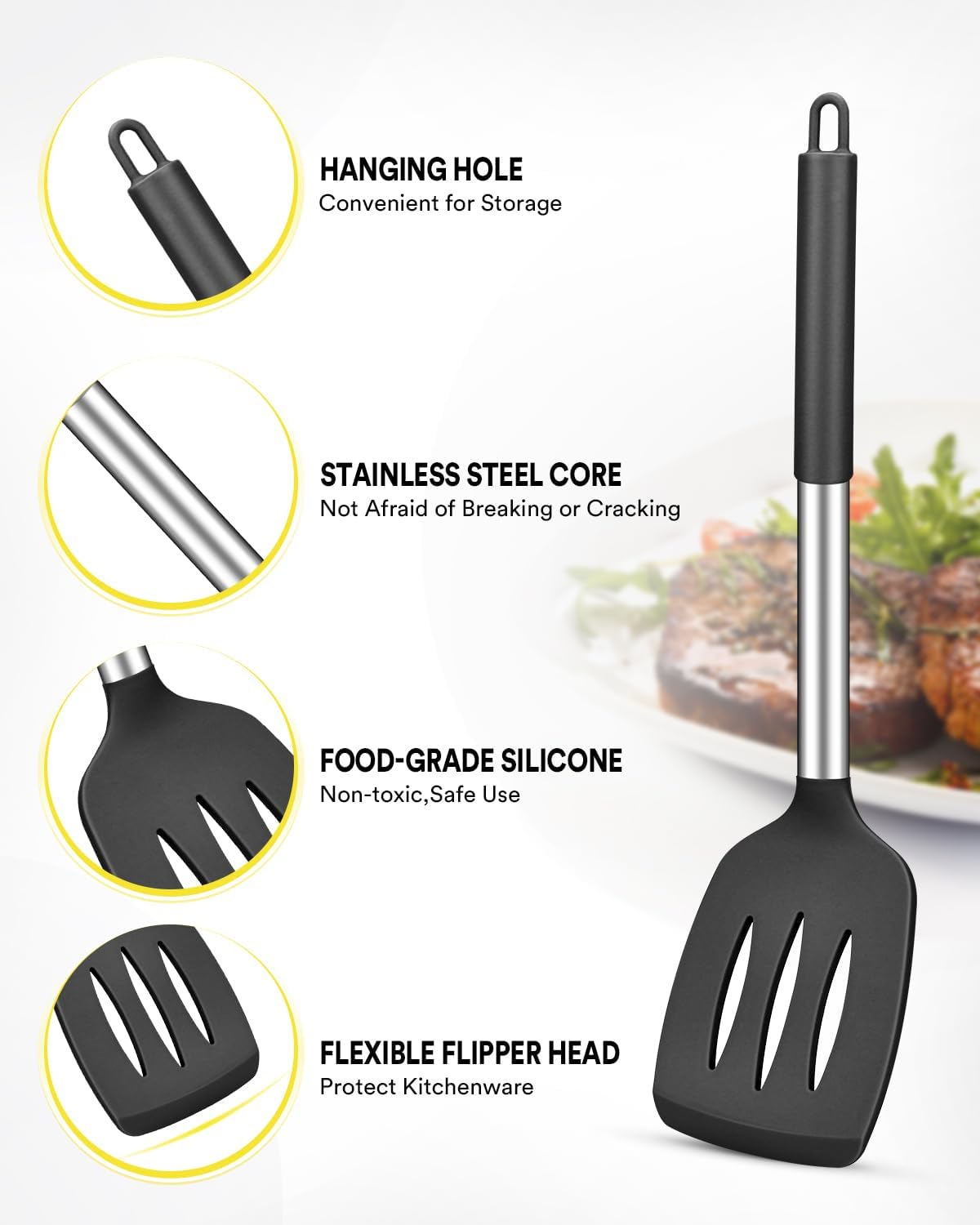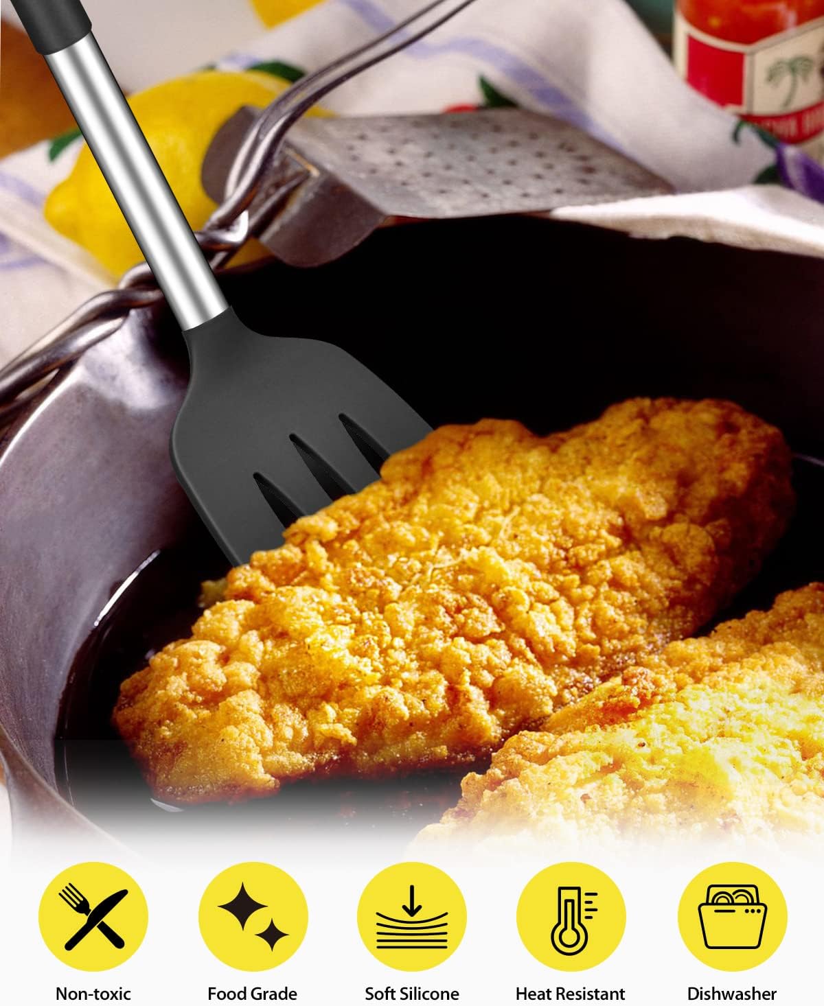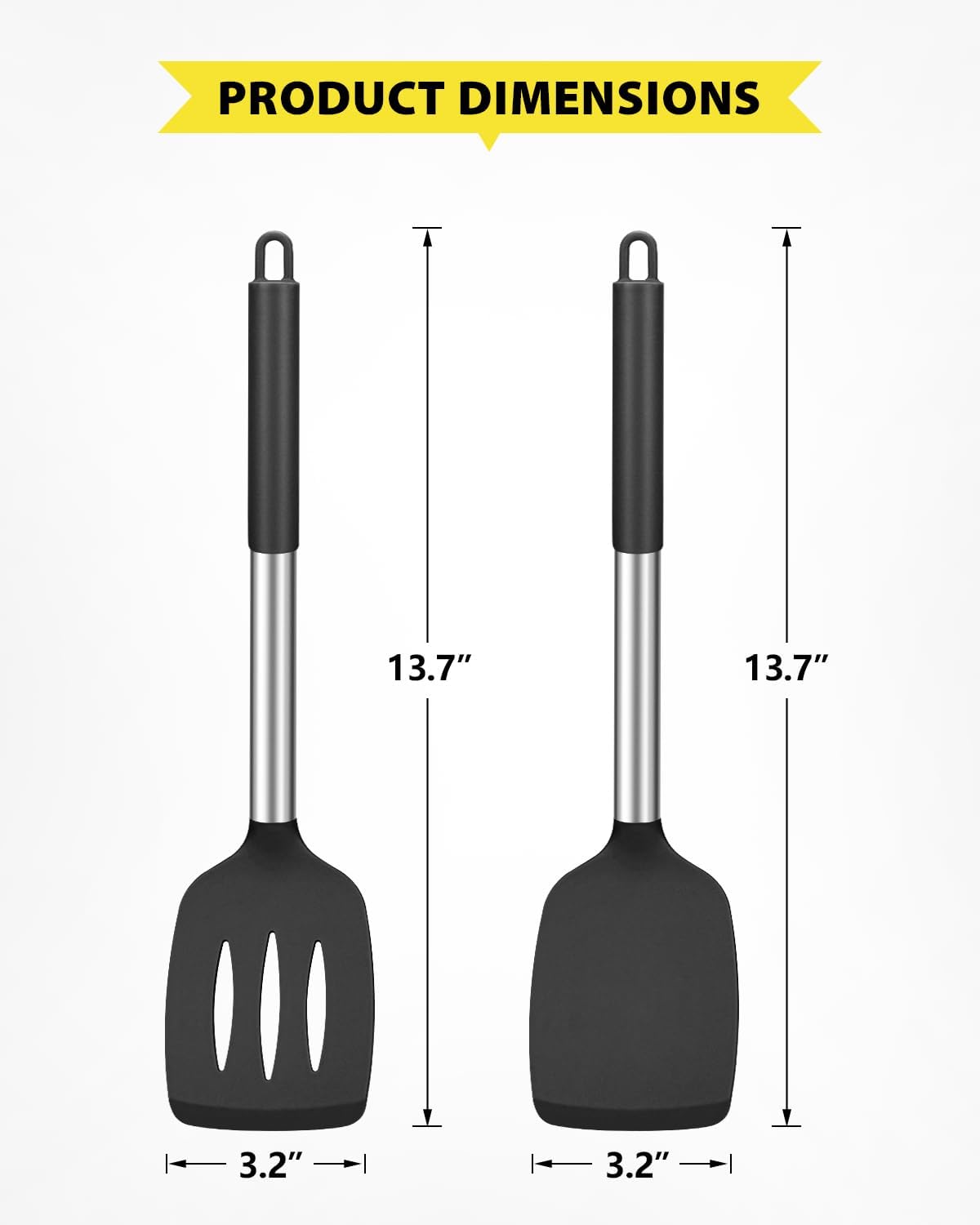 2 Pcs Silicone Spatulas Turners, Solid and Slotted Spatula Set, Non-Stick BPA Free High Heat Resistant Handy Kitchen Utensils for Cooking, Grill, Flipping Eggs, Fish, Pancake(Black)