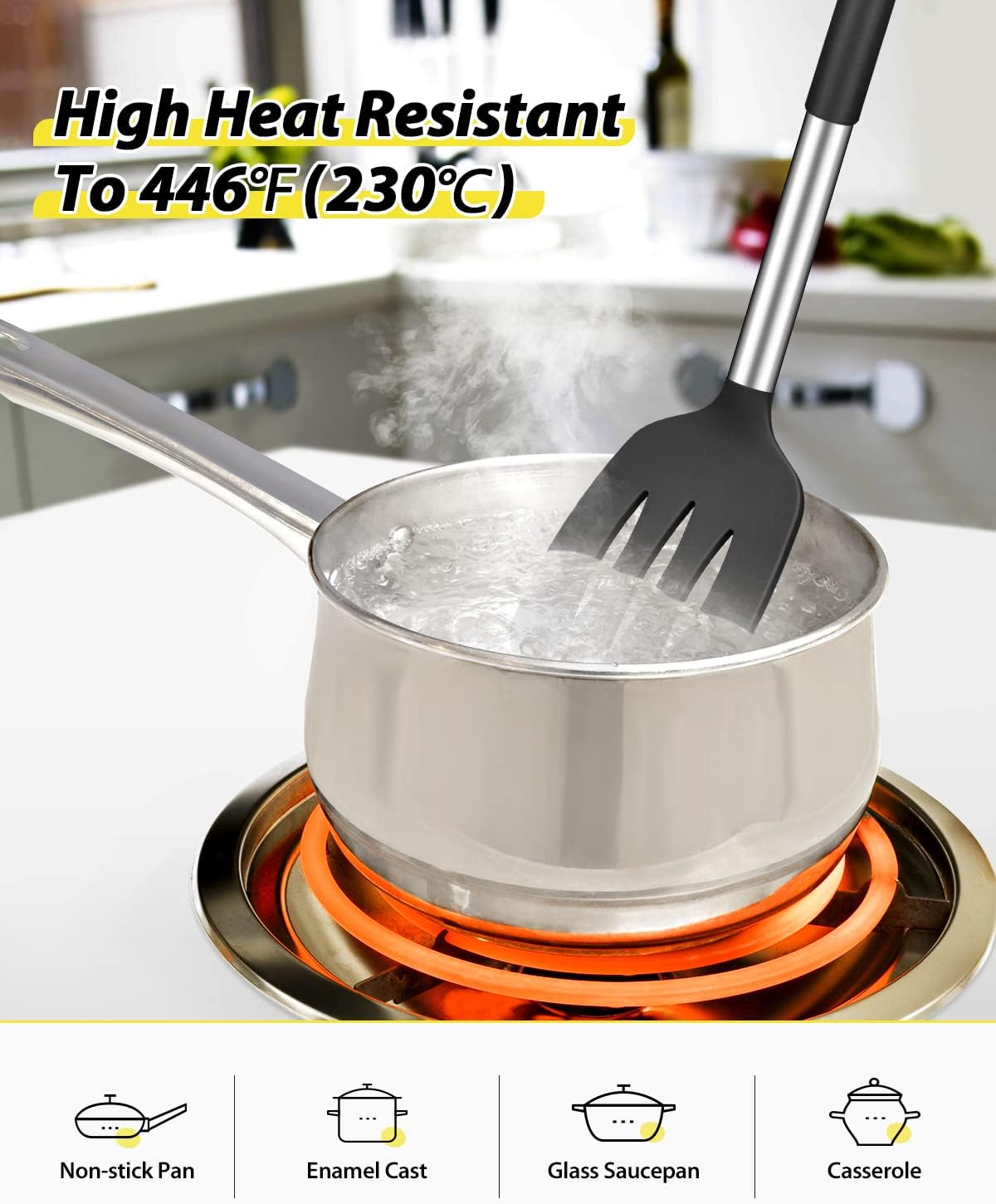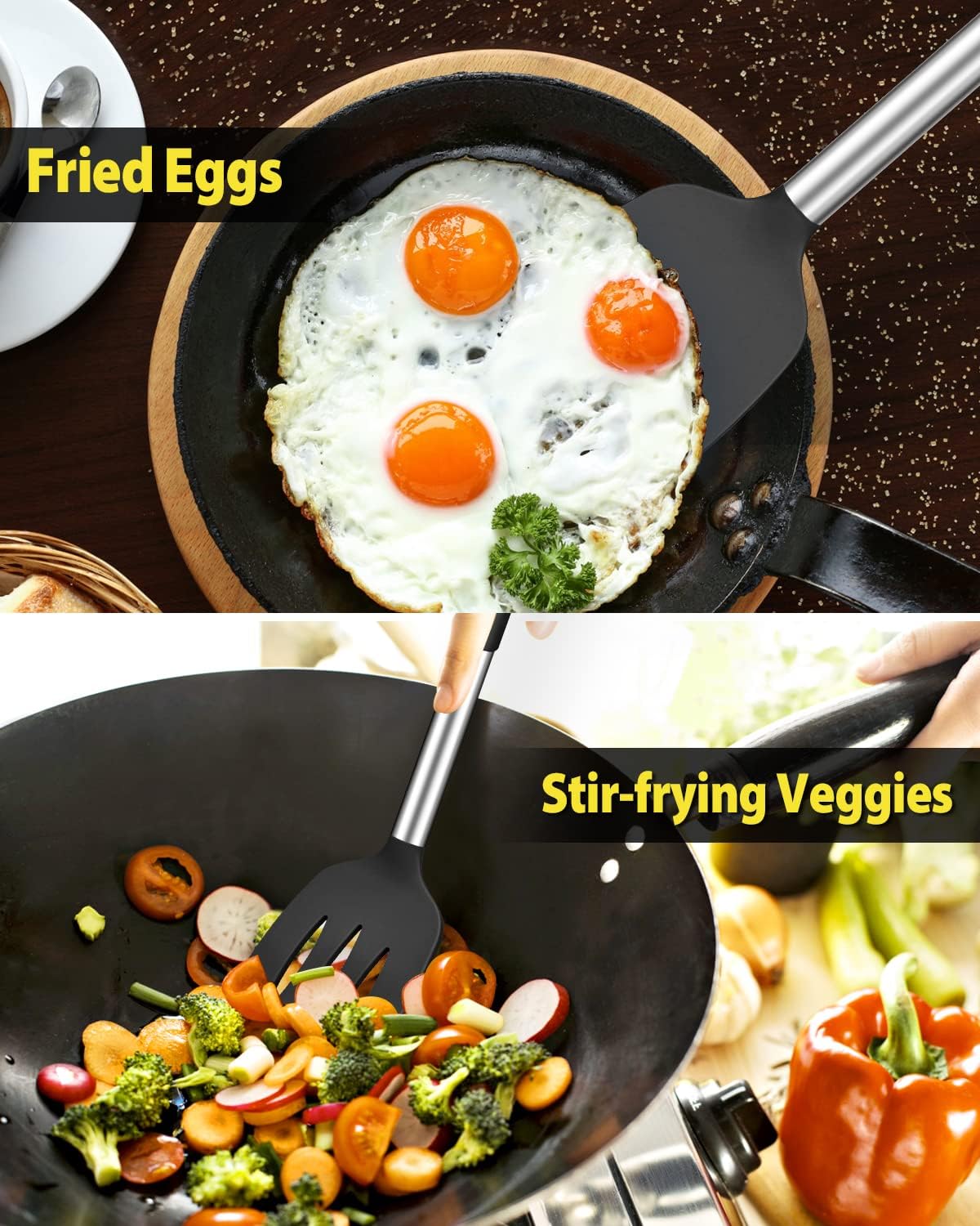 ❤【Ergonomic Design】: High-quality 18/8 stainless steel can keep you away from the trouble of cooking utensil rusting or cracking. The anti-scald silicone handle is not easy to conduct heat and is more pleasant to hold than traditional food cookware. The flexible edge is designed for noise-free cooking.