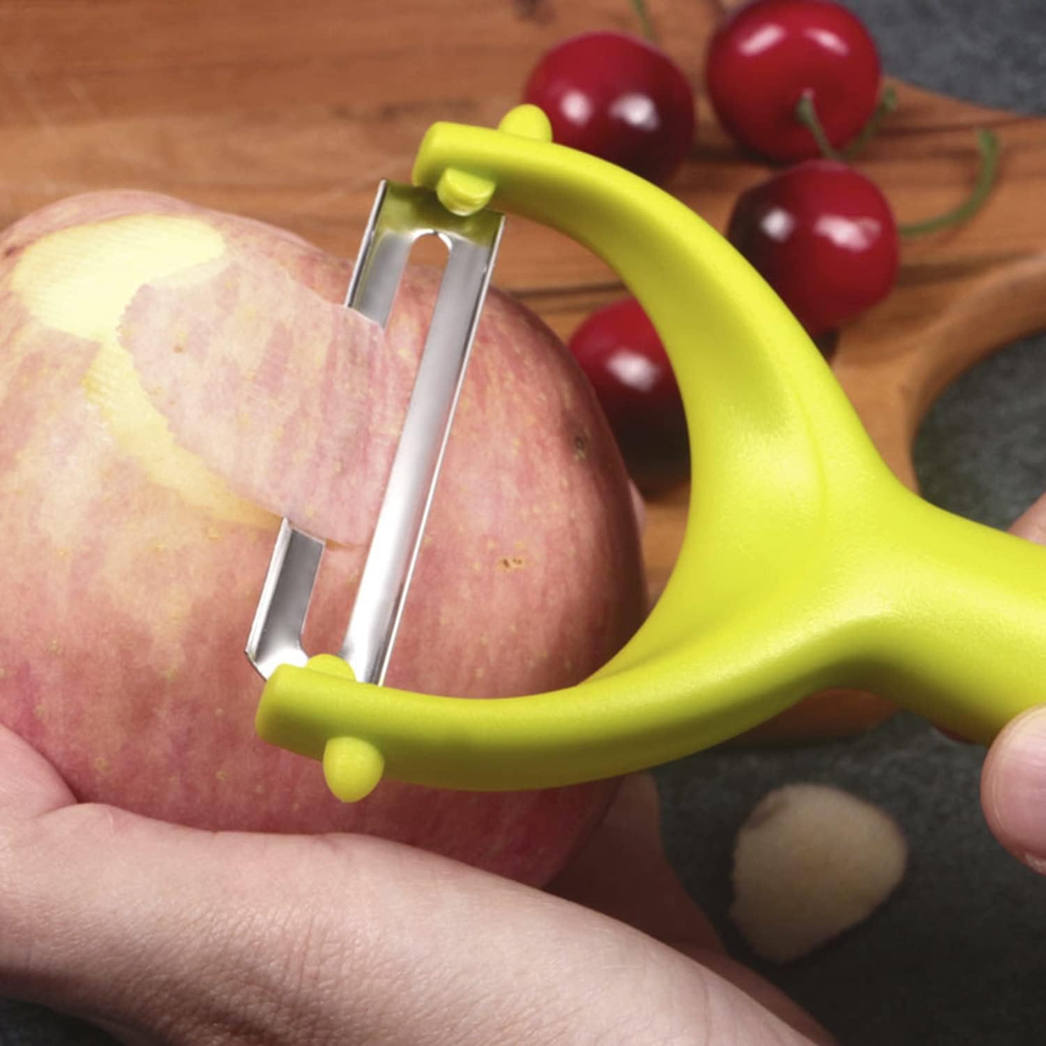 It fits the curved surfaces of apples, potatoes, and pears better during use. And the cutting edge of the blade is designed inward, this allows you to avoid injury to your fingers to a certain extent when you accidentally hold or press.