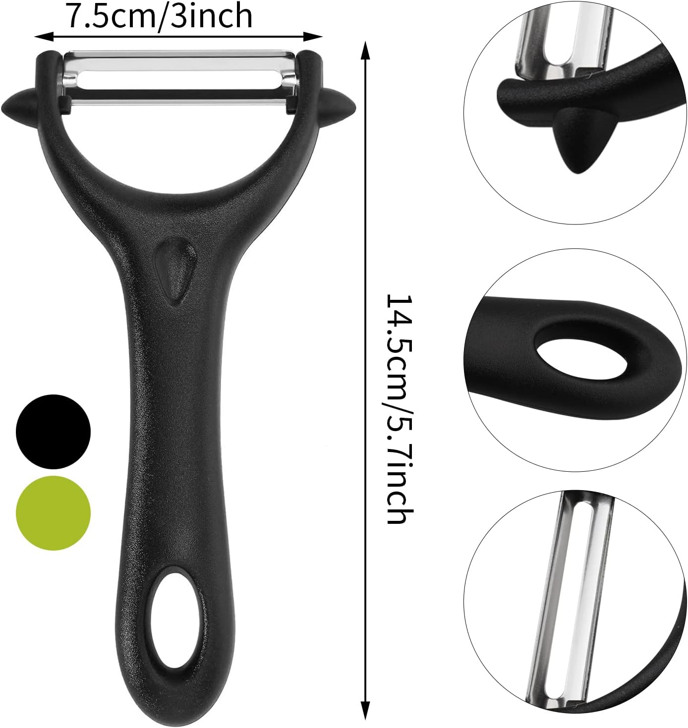 Specifications Color: black, green Material: stainless steel Size: 5.7×3 inch Handle Thickness: 0.5 inch Includes: 2 pcs potato peeler