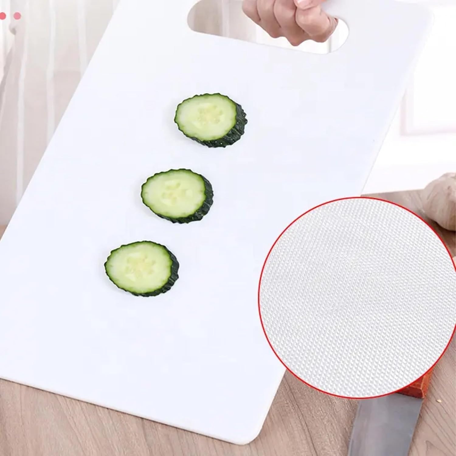 𝐄𝐍𝐇𝐀𝐍𝐂𝐄𝐃 𝐆𝐑𝐈𝐏 𝐀𝐍𝐃 𝐒𝐓𝐀𝐁𝐈𝐋𝐈𝐓𝐘: Cutting with precision requires stability and control. That’s why this Plastic Cutting Board is equipped with an easy-grip handle. This ergonomic feature provides a secure and comfortable grip, minimizing the risk of slips or accidents during food preparation.