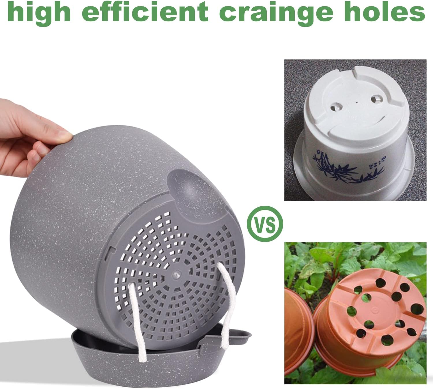 [Self-Watering Plant Pot] Our tray is designed to hold water.The plant soil and the cistern are connected by a cotton thread through which the plants can continuously absorb water from the cistern.The cotton thread sucks the water into the soil to provide nutrients for the plants.The porous design of the bottom of the tray ensures that the soil is breathable,so the plants will thrive even if you travel or travel.