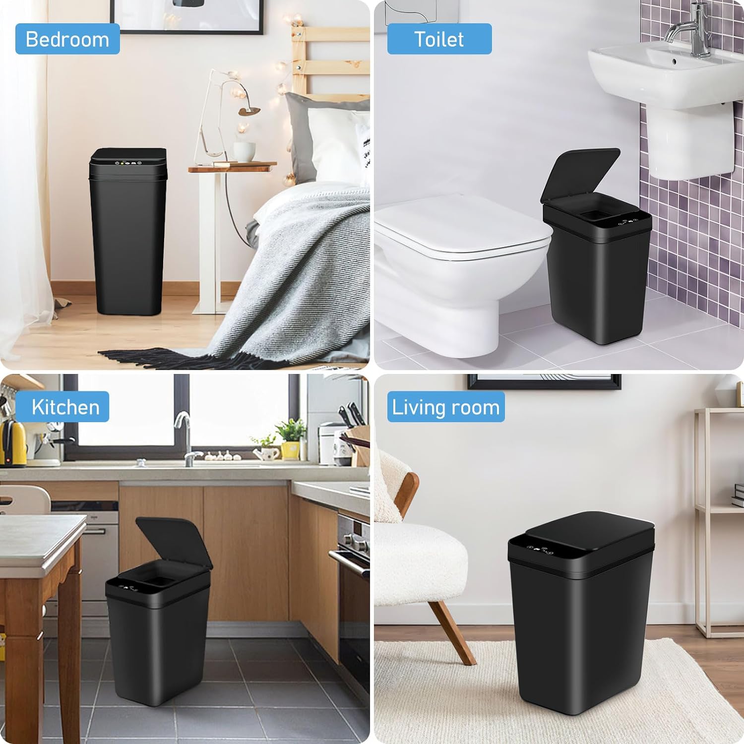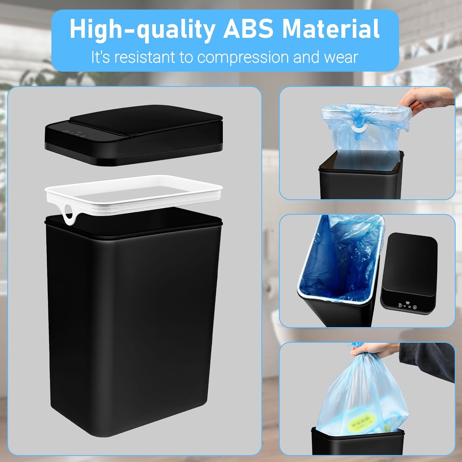 WATERPROOF AND MOISTURE-PROOF DESIGN – Our motion sensor trash bin adopt high-quality materials and advanced design. This automatic trash can still maintain the sensitive opening and closing performance of the bucket lid in the daily wet and splashing environment, It is not afraid of water splashing, and there is no problem of touch failure. So it is very suitable for toilet, bathroom, living room, bedroom.