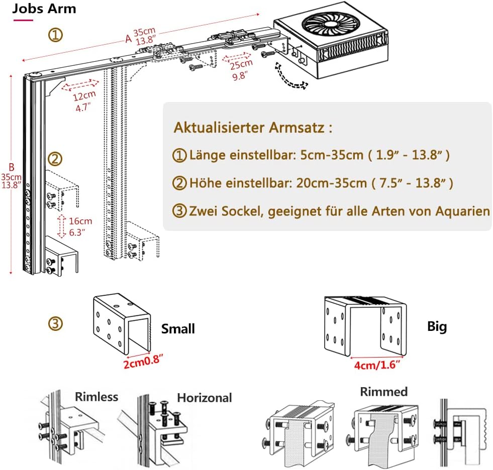【Newest Adjustable Bracket】Send the 2 kinds of mount bases (both the 2cm and 4cm base), which would be easily mount your light on all type of tanks (Rimless, Rimmed, Horizonal…).