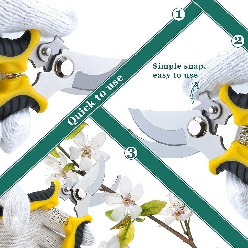 Safety Lockafety lock mechanism, manually lock when not in use to protect the bladeHigh Quality SpringSpring opens smoothly for each cut, minimize the strain on your wristQuality Sharp BladeHigh quality chrome 3Cr13 steel with anti-rust processing.Anti-slip HandleComfortable handle with anti-slip material , corrosion resistance,ergonomic design, can be operated with one handNote: If the gloves smell plastic, this is normal. Please wash your gloves when you use it for the first time Certain substances,such as resinous sap,will damage the blades, so keeping your garden shears kit cleaned and well-oiled can make them last longer.
