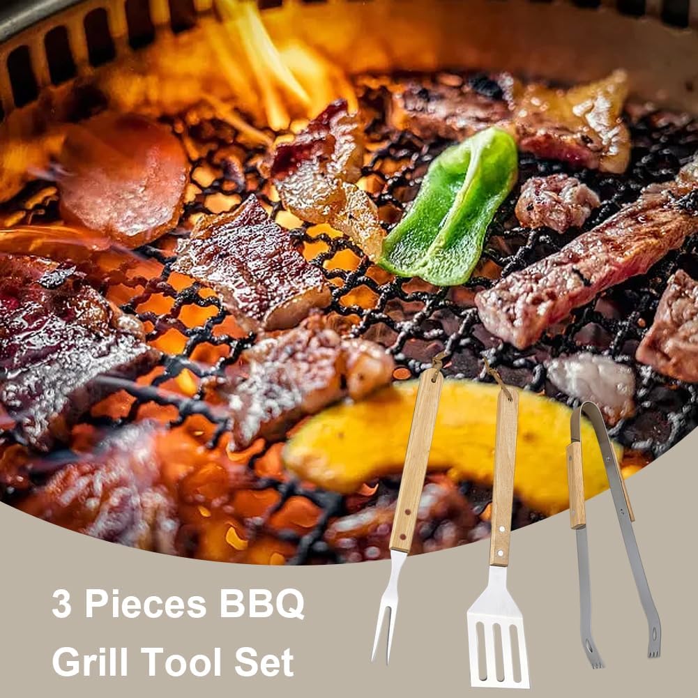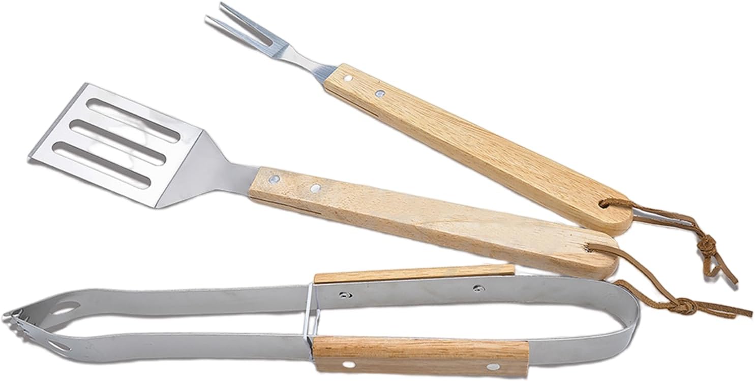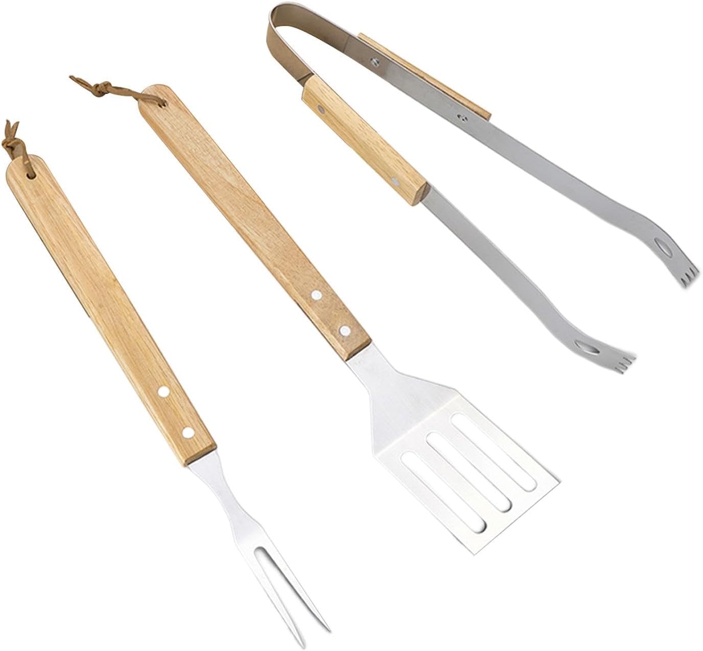 3-Piece Heavy Duty Wooden BBQ Grilling Tool Set Stainless Steel Multi-Function Spatula, Fork & Tongs Barbecue Grill Utensils for Outdoor Grill Camping Accessories