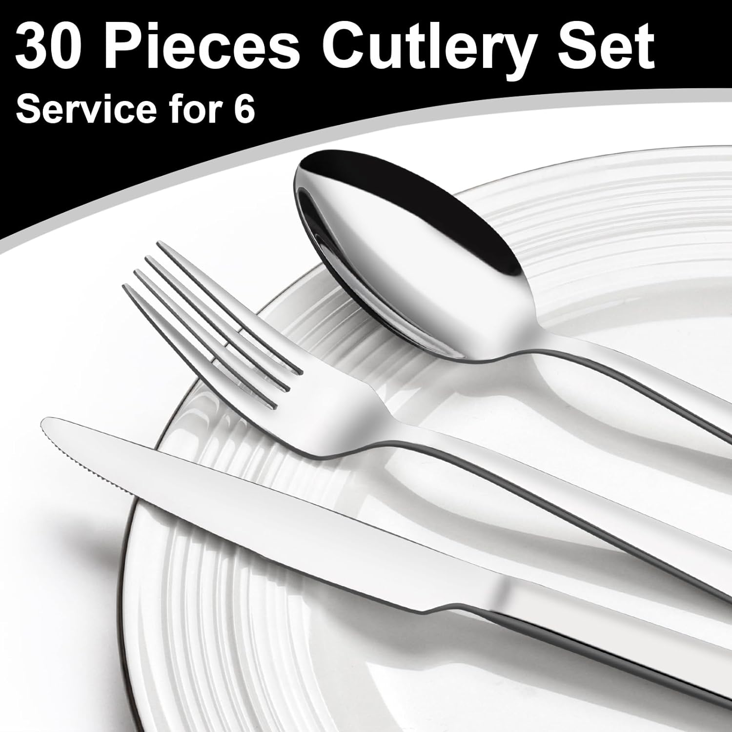 30 Piece Cutlery Sets with 6 Piece Steak Knives, Stainless Steel 30-Piece Silver Cutlery Flatware Set, Dinnerware Fork Knife Spoon Set Service for 6, Mirror Finished & Dishwasher Safe