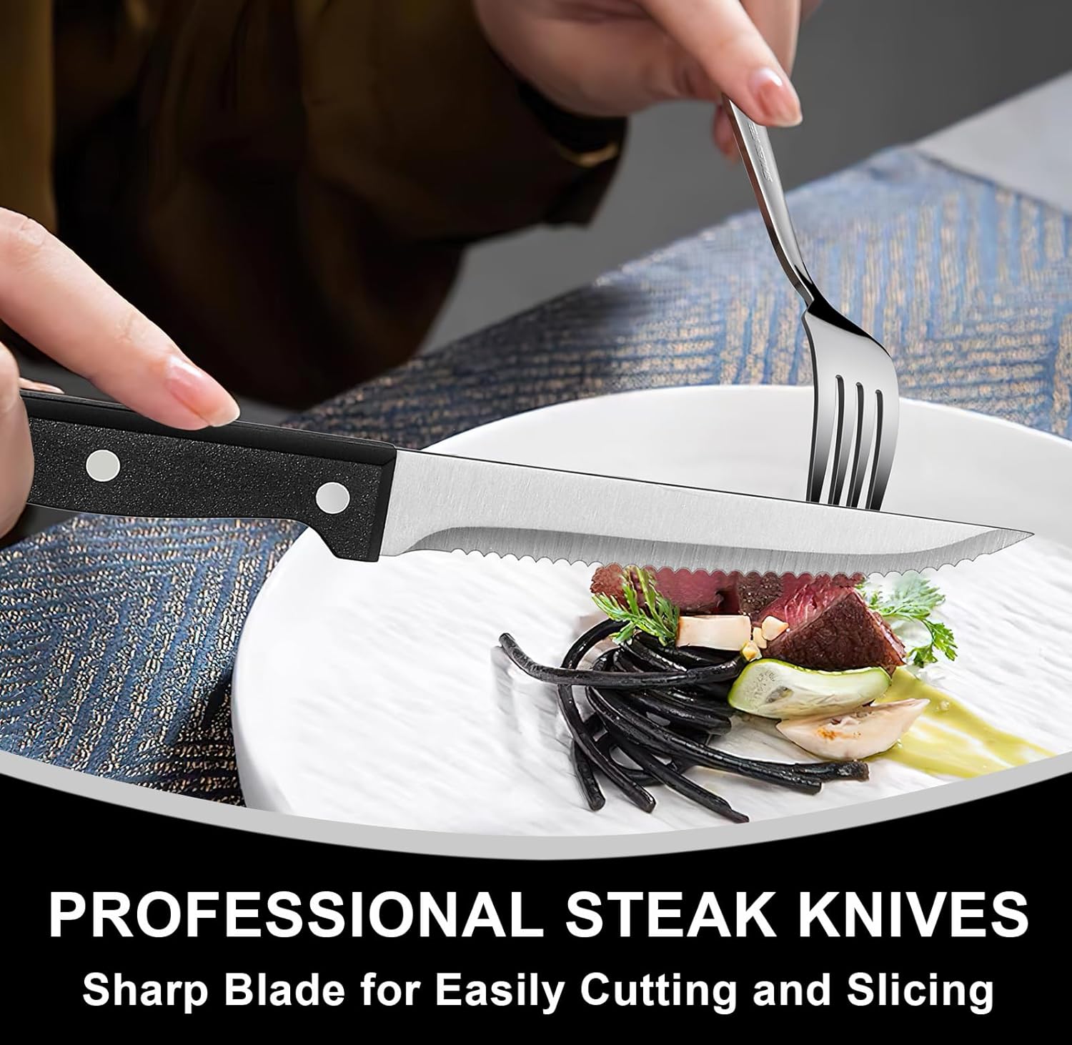 【Steak Knives Set】Come with additional 6pc classy steak knives set, Micro-serrated sharp edges for cutting meats effortlessly and never need sharpening, Triple-riveted handle provides balance and comfort, One piece design for easy control, Suitable for dinner, kitchen, bbq