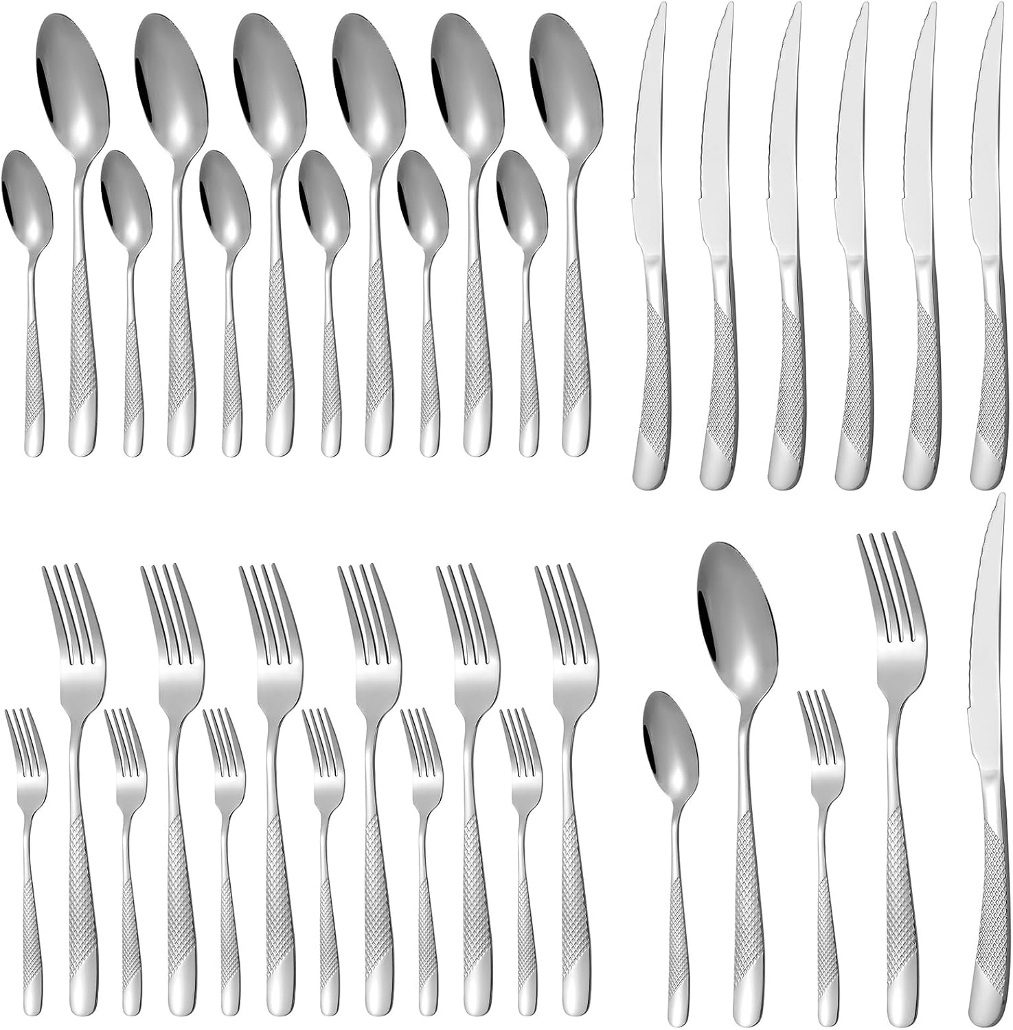 【Hammered Pattern & Mirror Polished Design】Classic & fashion hammered design can decorate your dining table and kitchen perfectly. The anti-slip function of the hammer grain handle can provide greater grip, preventing the tableware from slipping from your hands. Moreover, the cutlery has been polished so that the smooth surface will not hurt you.