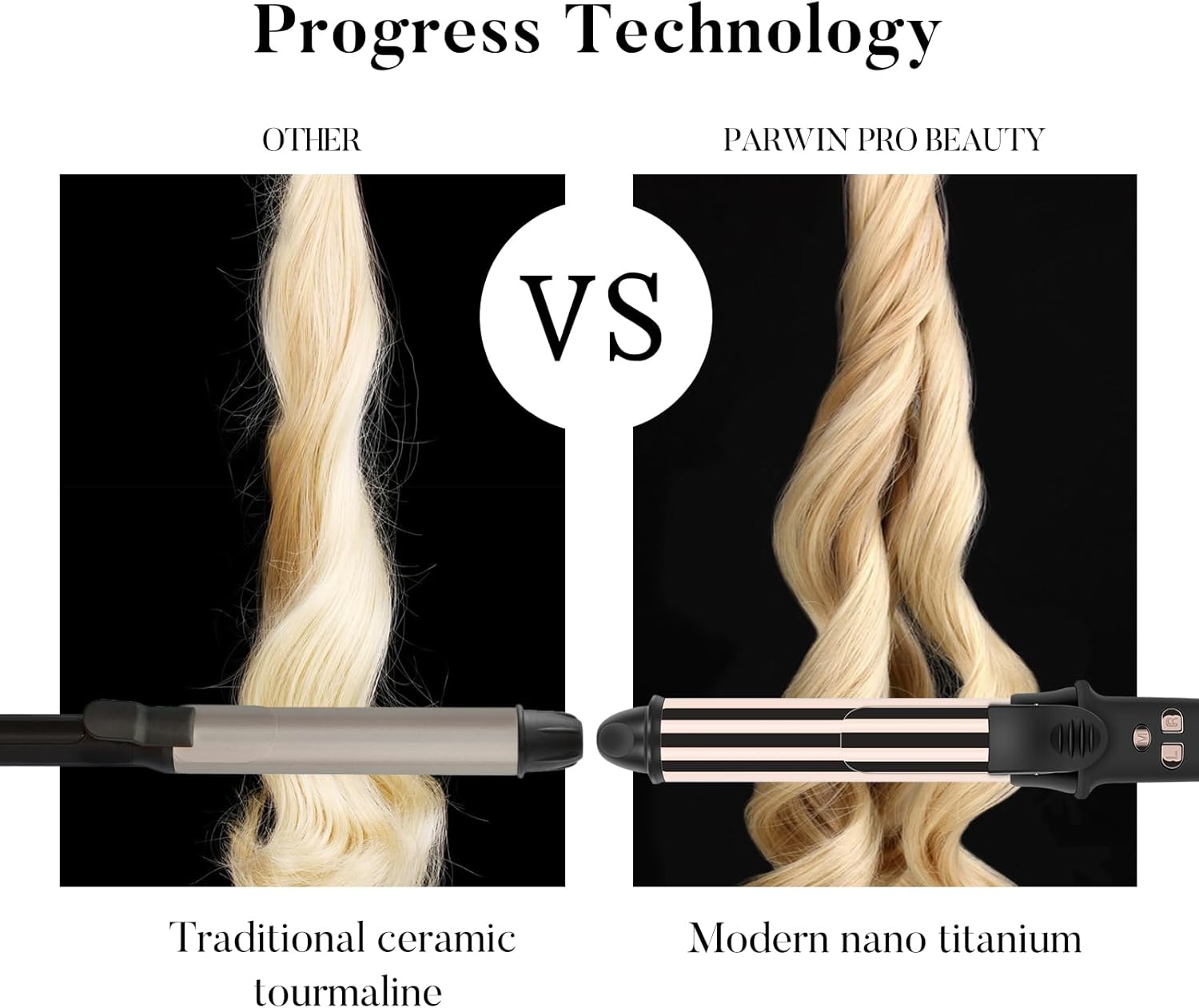 TITANIUM NANO COATING — The hair iron uses titanium nano-material, which has good heat conductivity and corrosion resistance, making heating more efficient, heat distribution is more even than general curling wands, so curly hair is heated more evenly. And generates negative ions which are beneficial to the hair, making the curly hair look shiny and soft.
