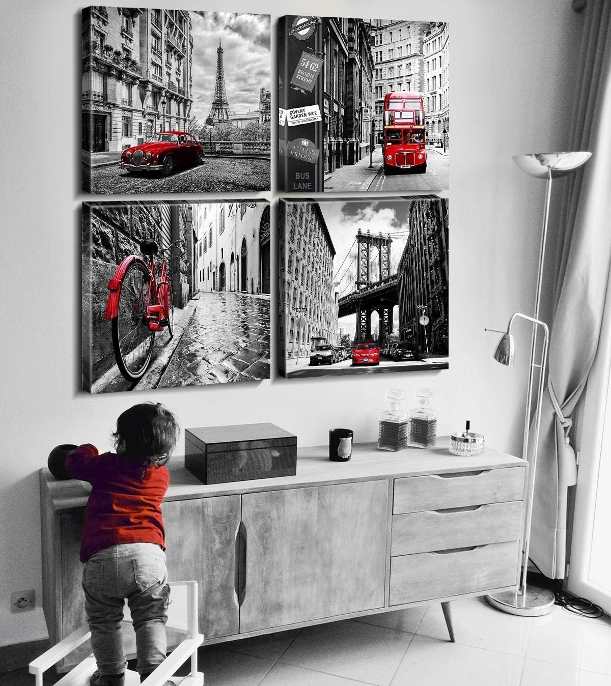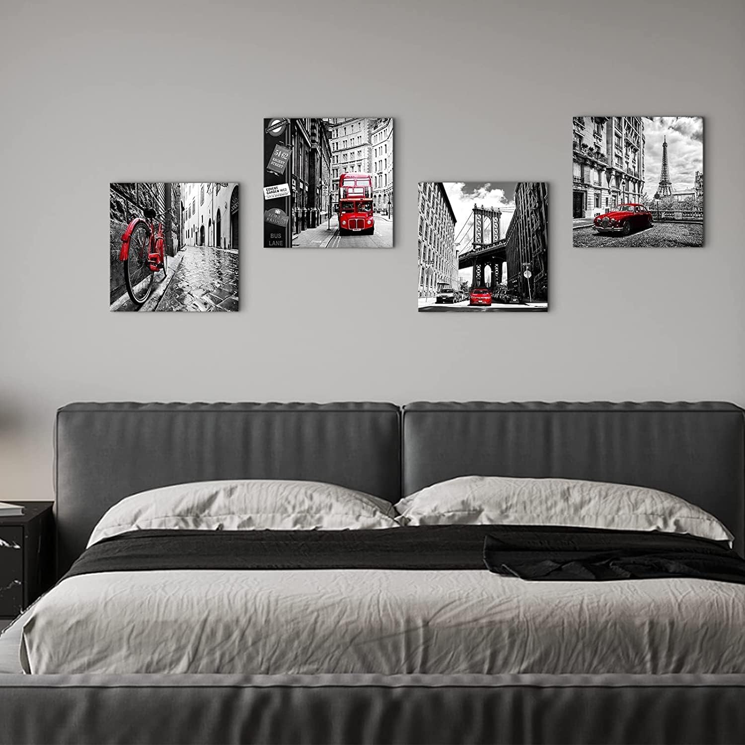 【Black and White Red Wall Art Size】: 12 x 12 inch x 4 ( 30 x 30 cm x 4 panel), total 4 Panels. Color: black, white, red. Paris cityscape posters: London street red double decker bus /New York Brooklyn Bridge car/bicycle at Italy Rome/vintage car under the Paris Eiffel Tower. Black and white red contemporary bedroom wall art is proper for you to hang on the walls, whisking yourself away on a romantic and nice adventure journey!