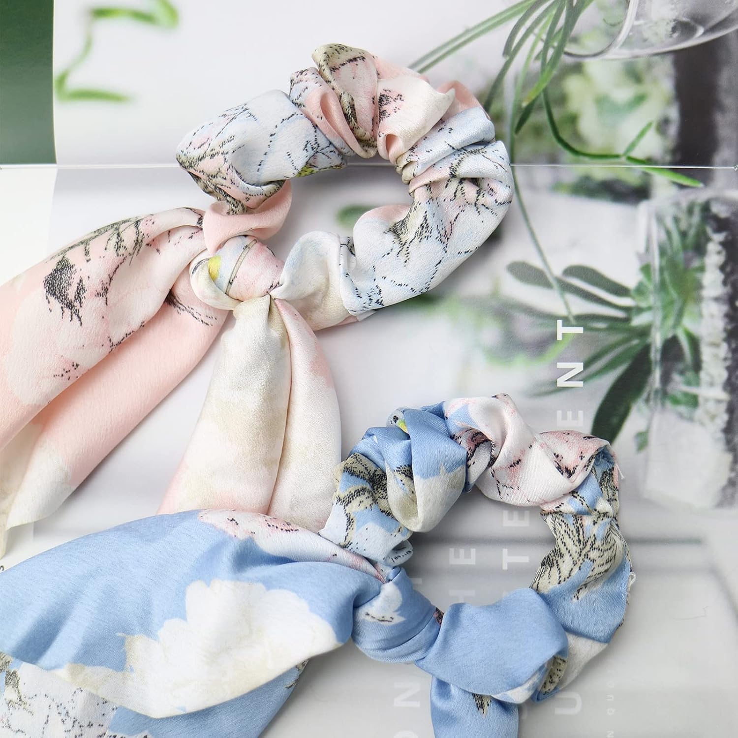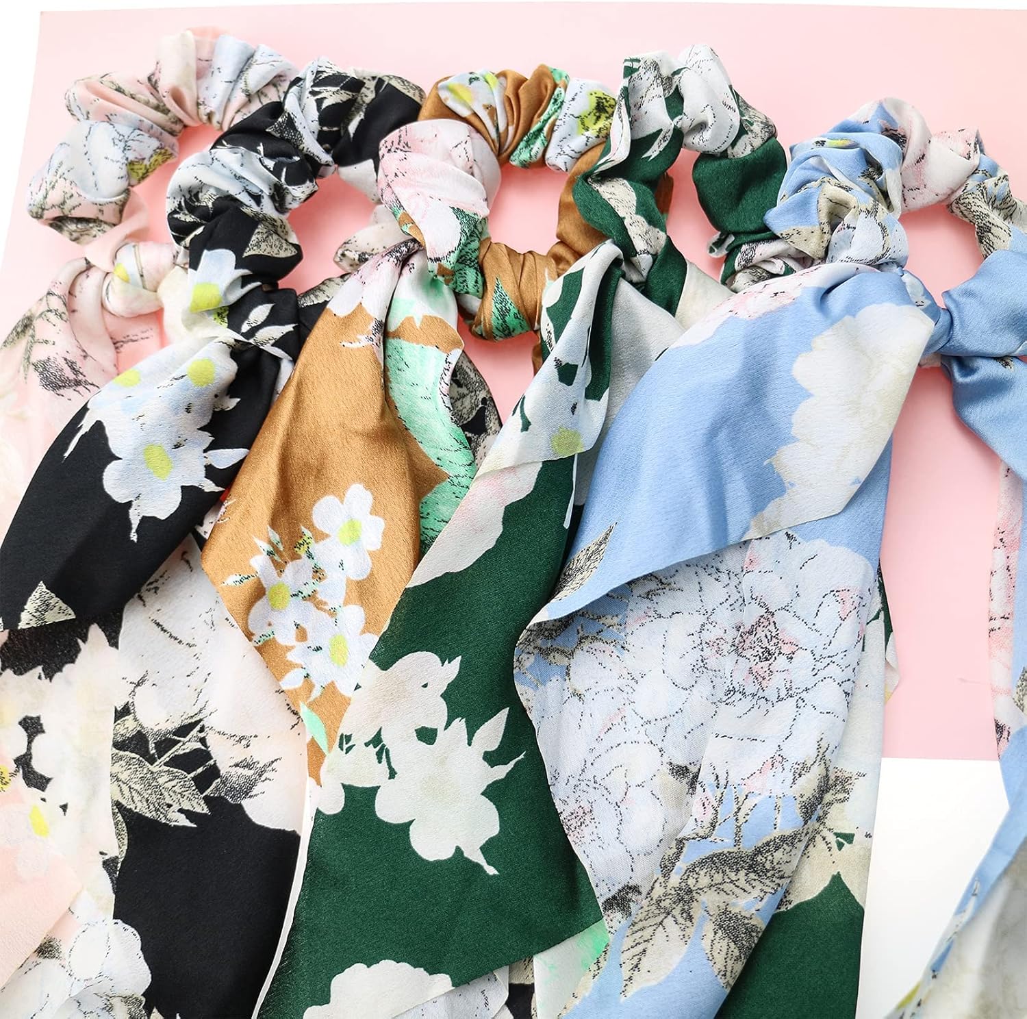 5 Pieces Satin Hair Scrunchies with Bow Floral Hair Band Elastic Hair Bands Hair Scarf Hair Ties Ponytail Holder Hair Accessories for Women Girls