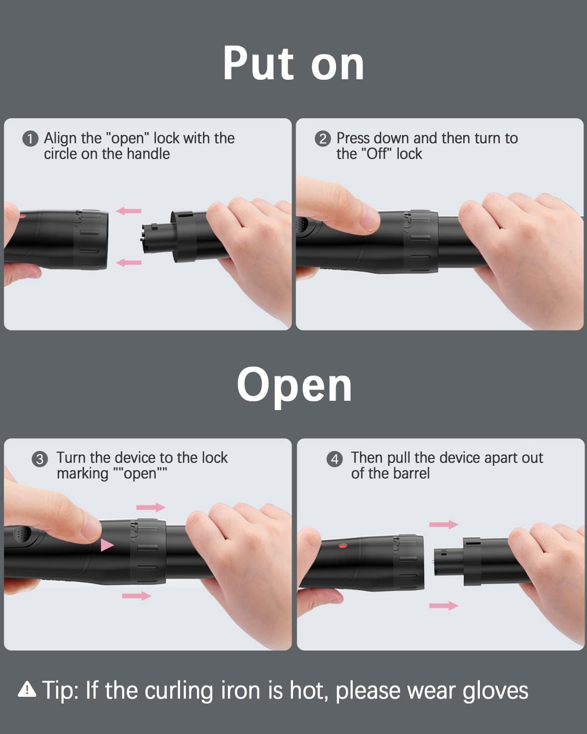 Tip: If the curling iron is hot, please wear gloves