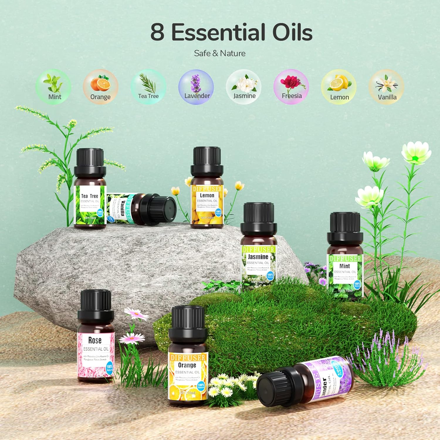 【8 Essential Oil】This oil diffuser set comes with 8x10ml 100% natural pure organic oils including Lemon, Lavender, Mint, Rose, Orange, Tea tree, Vanilla, and Jasmine. You can choose the oil that you like and bring a different taste to your room.