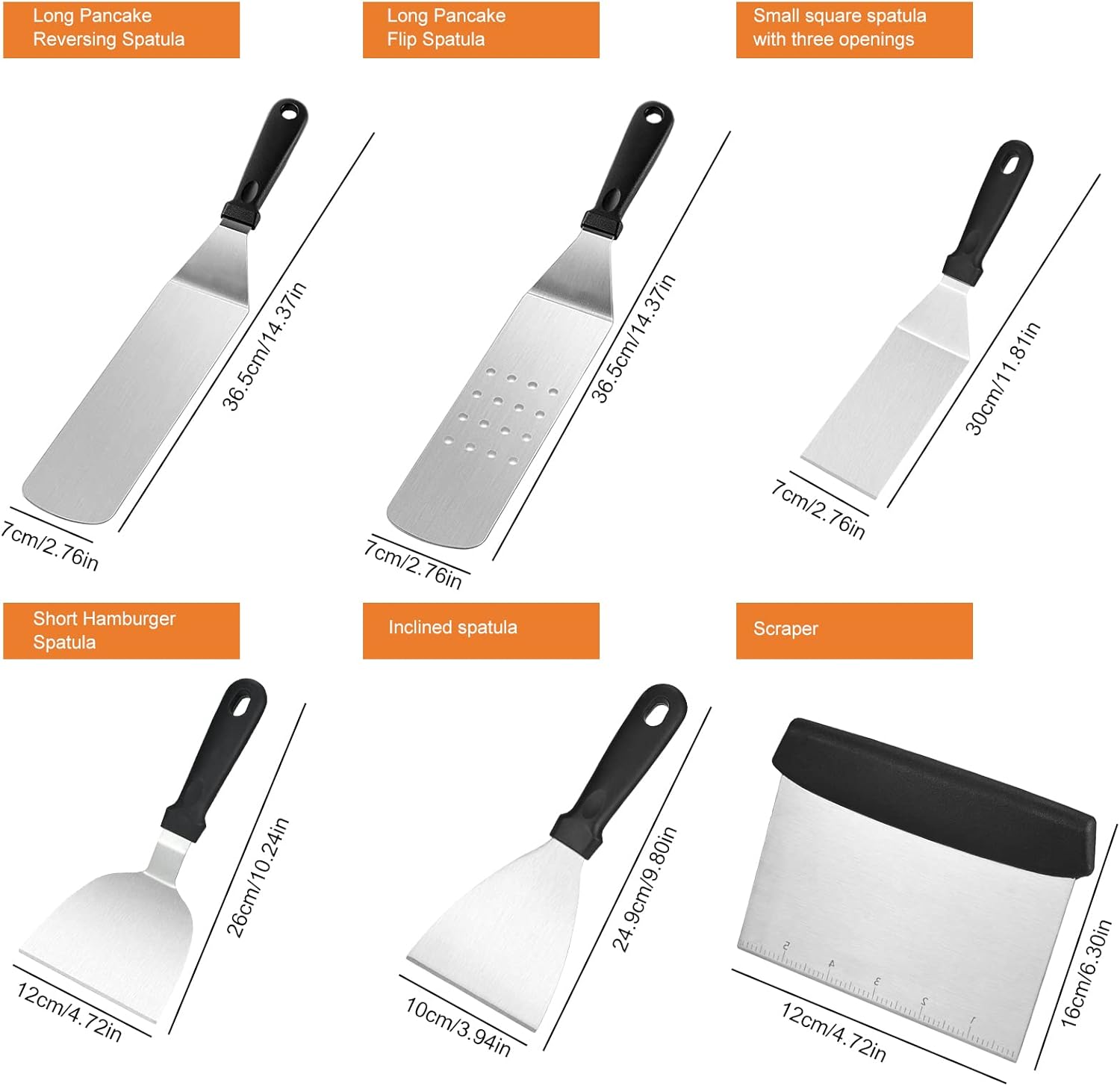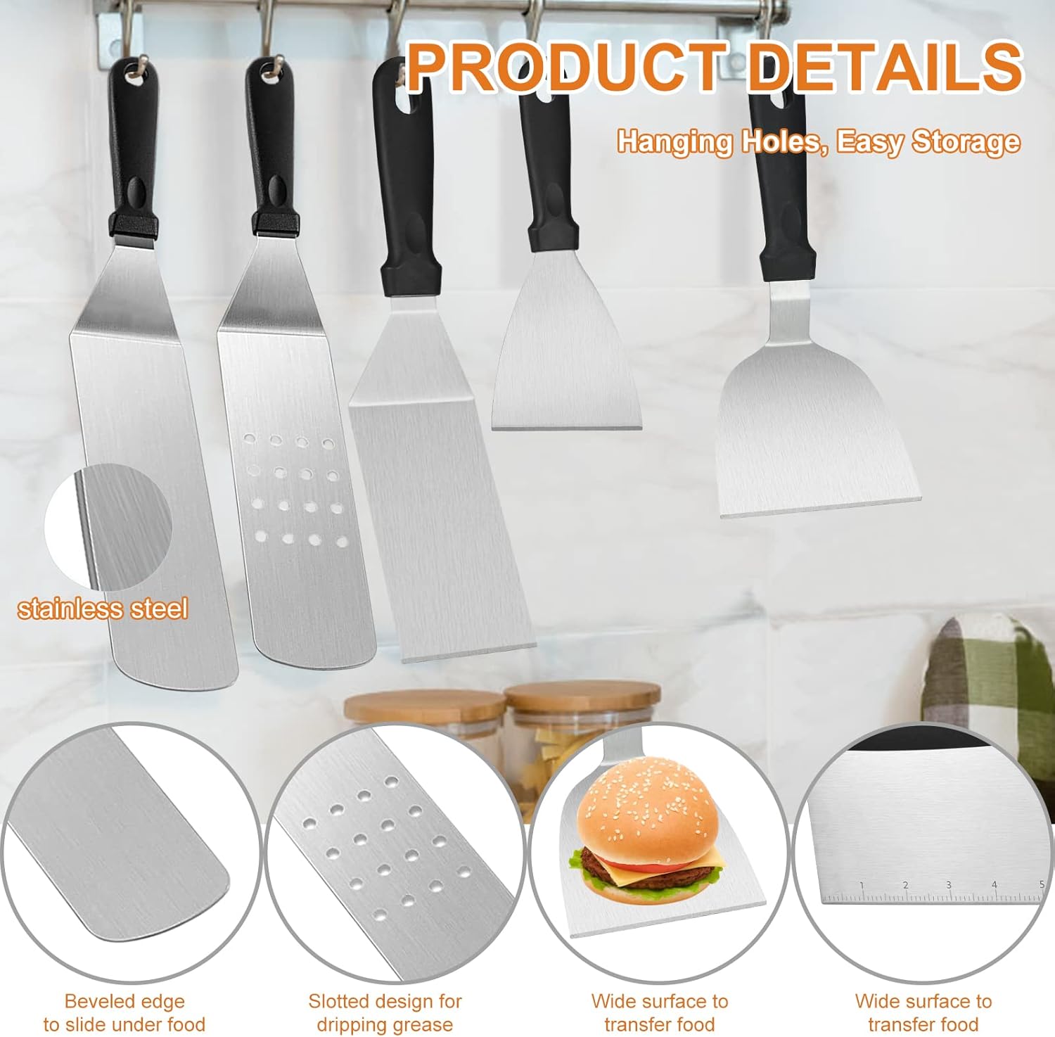 Our grill spatula is made of durable thicker stainless steel, and the griddle tools feature rust that let you build beautiful burgers, juicy tacos, and succulent steaks from start to finish!
