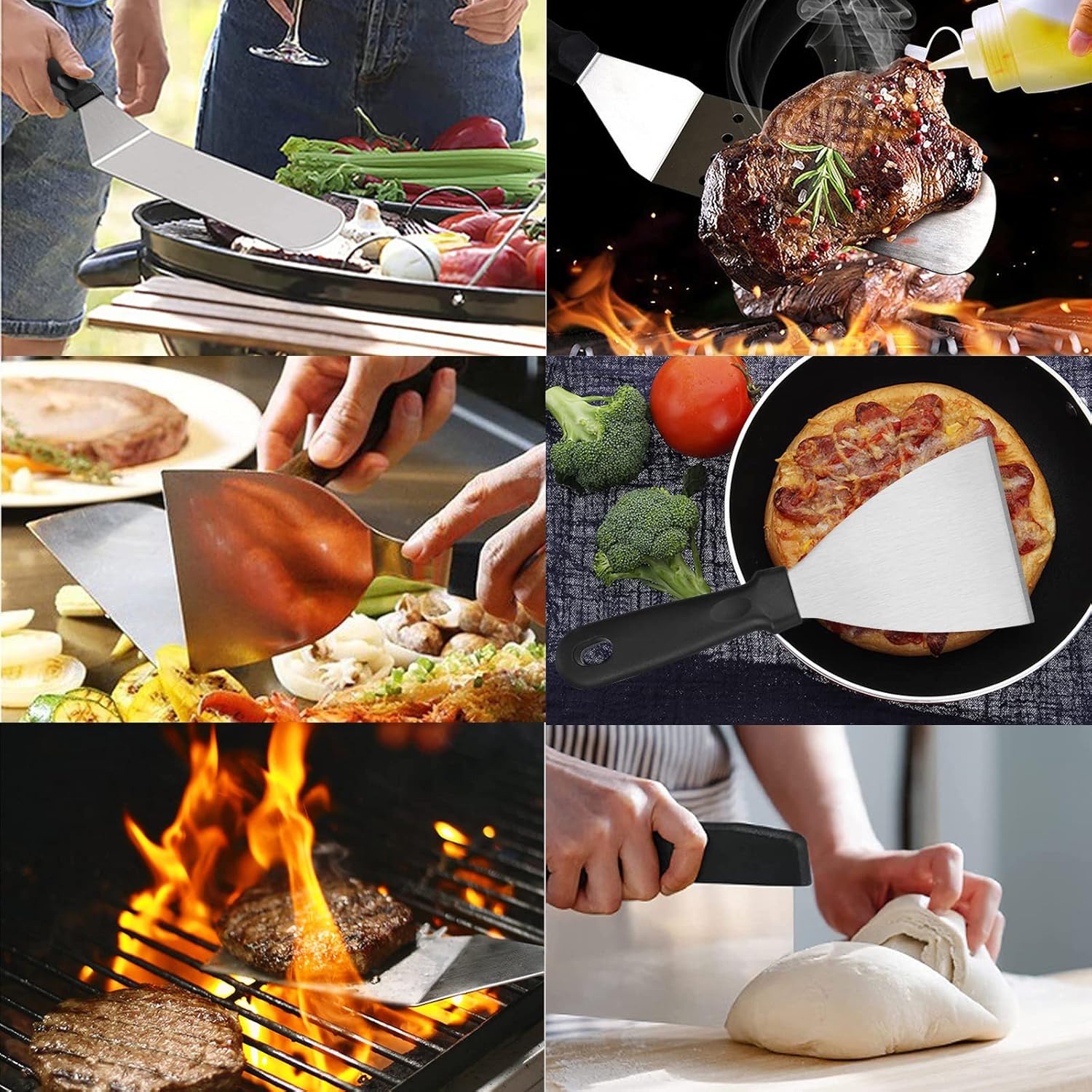 【Easy to Clean】The grill pan spatula set is dishwasher safe and can also be easily hand washed with water and soap, making it easy for you to enjoy a delicious barbecue with your family. NOTE: After using the dishwasher or hand washing the flat grill scraper, make sure to dry it to ensure a long service life.