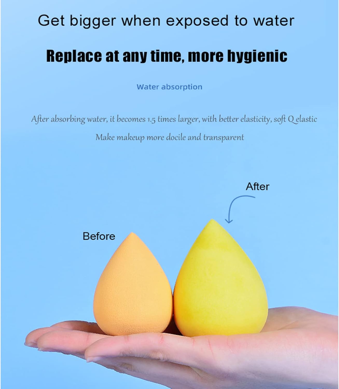 【WATER ACTIVATED】 – as for fundation or concealer, these cream/liquid make up. Wet use will be more applicable. Once wet, the blender will almost grow to 1.5 Times its original size. Squeeze out excess water, use a tissue to squeeze the little remain. Now add your favorite applicator to apply evenly and smoothly to your face.
