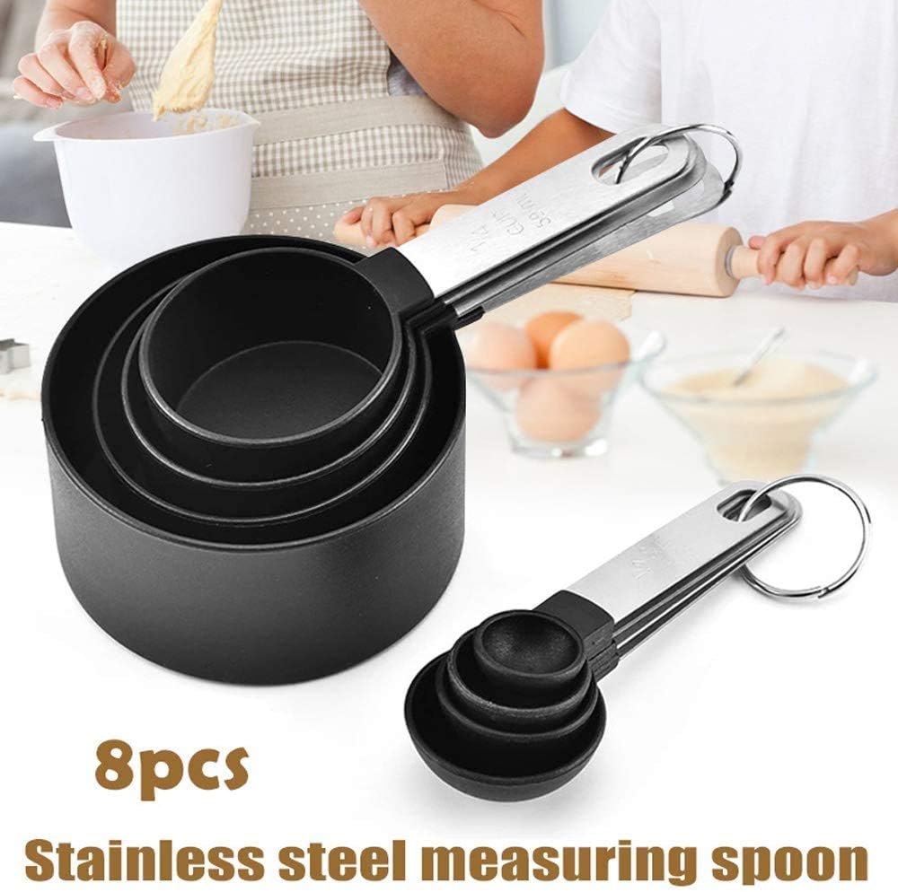 8-Piece Measuring Cup and Spoon Set, Plastic Measuring Cup and Spoon with Stainless Steel Handle, for Liquids and Solids, for Cooking Kitchen (Black)