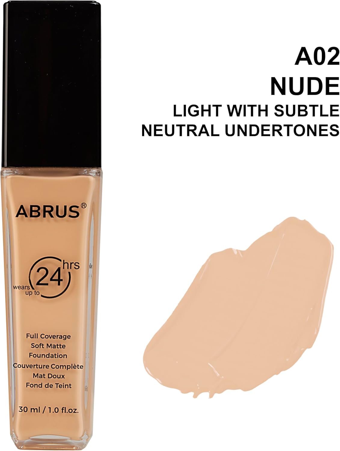 ABRUS Foundation Makeup – Flawless Matte Liquid Foundation for Full Coverage up to 24 Hours (A02 Nude, 30 ml)