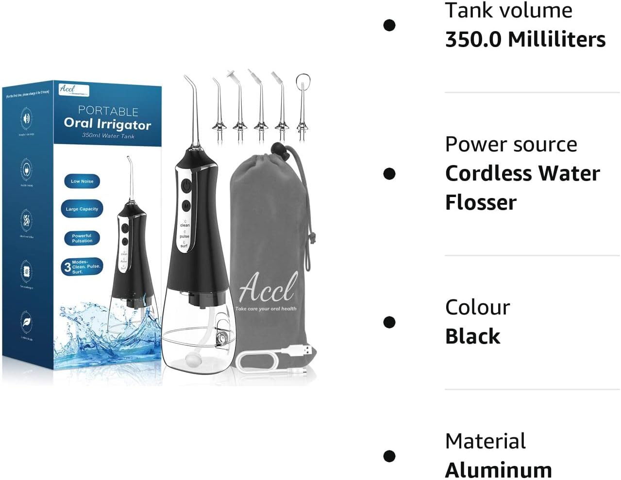 ACCL Water Flosser Cordless Teeth Cleaner, 350ML Portable Cordless Dental Oral Irrigator for Tooth Care Home Use and Travel, 3 Modes with 5 Jet Tips & Travel Bag, Black