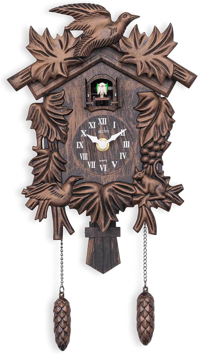 Antique finish plastic case wall clock with hourly cuckoo chime. Volume control, auto night shut-off. Quartz movement.