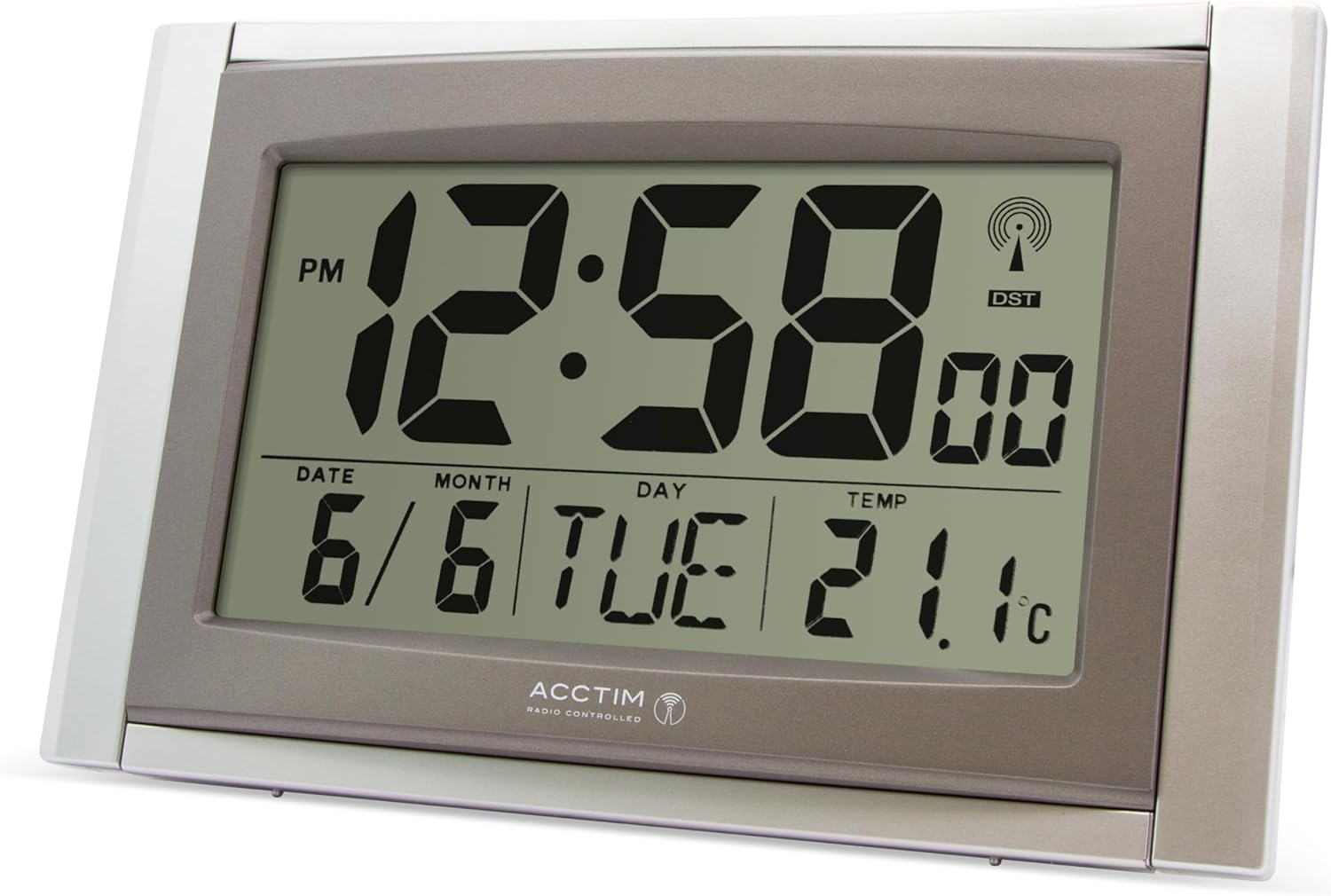 Acctim Stratus Digital Wall/Desk Clock Radio Controlled Tabletop LCD Display Date & Thermometer Silver