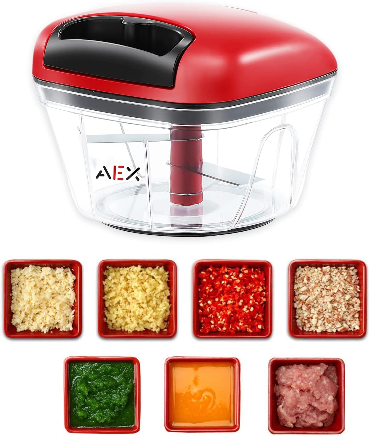 Operation Steps: 1) Cut food into small pieces and place them in the container. 2) Secure the lid by turning it left. 3) Pull the handle multiple times to chop food. 4) You will Get Chopped food Into AEX’s food chopper into a bowl.Customers say