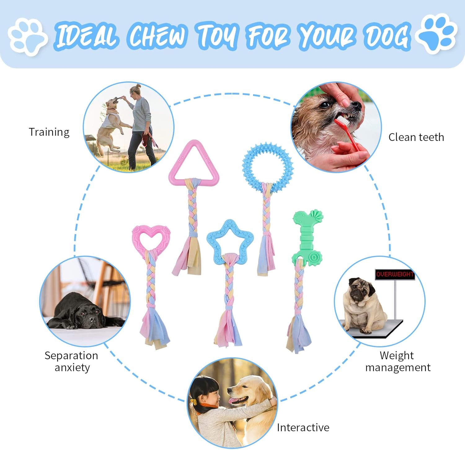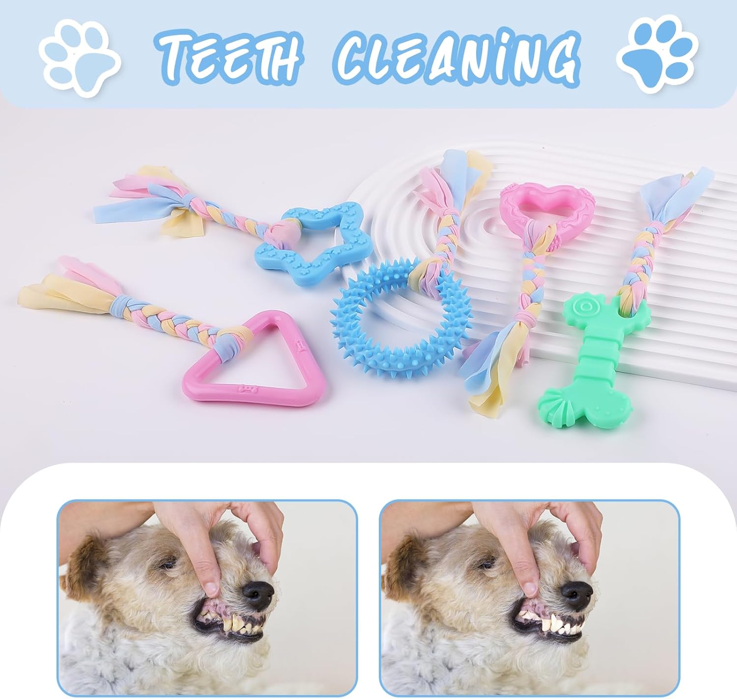 【CHEWING TOYS SET】Our dog chew toy includes 1 x blue thorn ring,1 x green bone, 1 x pink heart, 1 x blue star,1 xpink triangle.These durable puppy chew toys are pet favorites.keeps the dog away from shoes and furniture to avoid demolition of the house