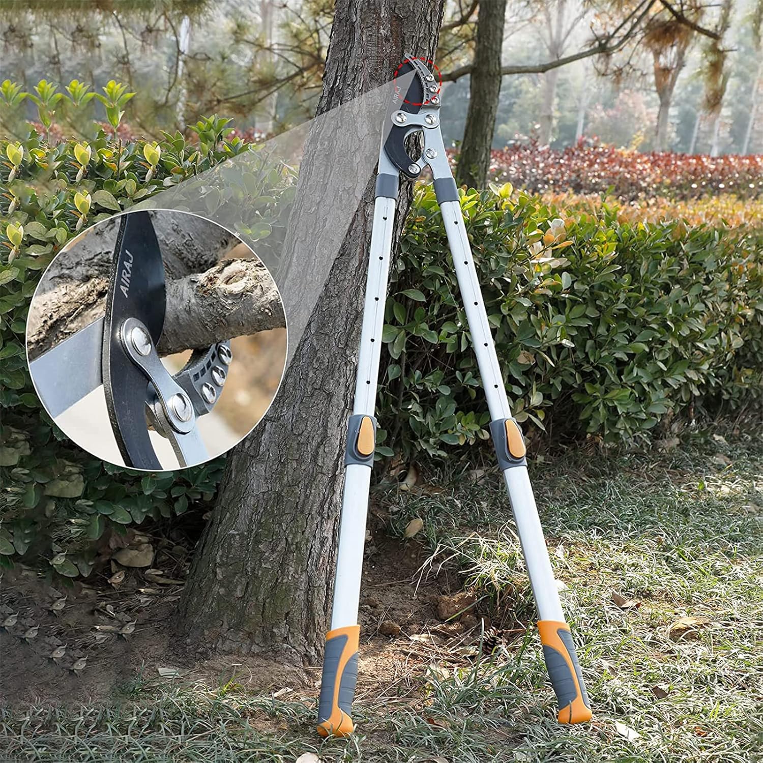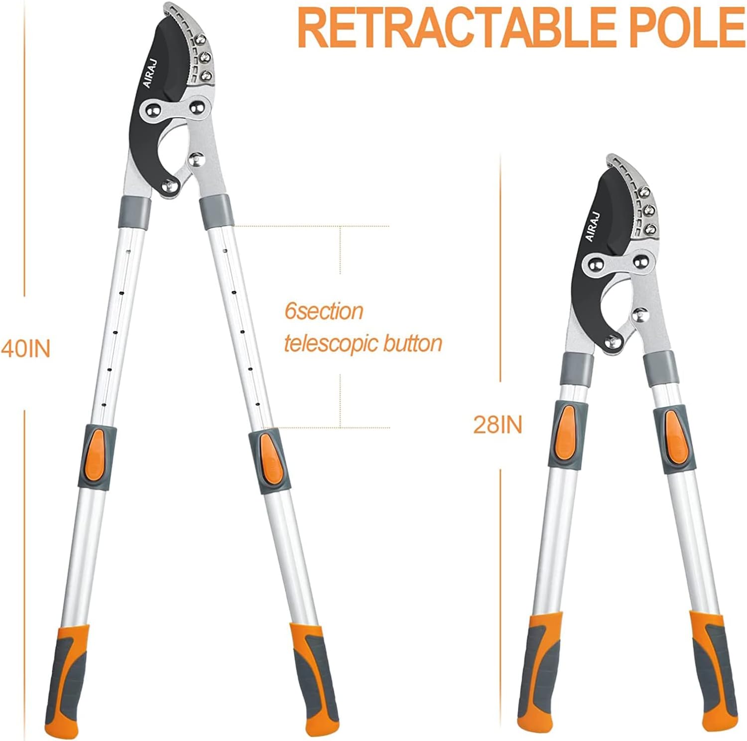 🌳【ALUMINUM ALLOY & ANTI-SLIP GRIP】AIRAJ Tree Loppers Telescopic aluminum alloy rod has strong hardness and corrosion resistance, it will keep straight and not shake when adjusted to the longest length. The rubber design at the handle can prevent slip and improve work efficiency.