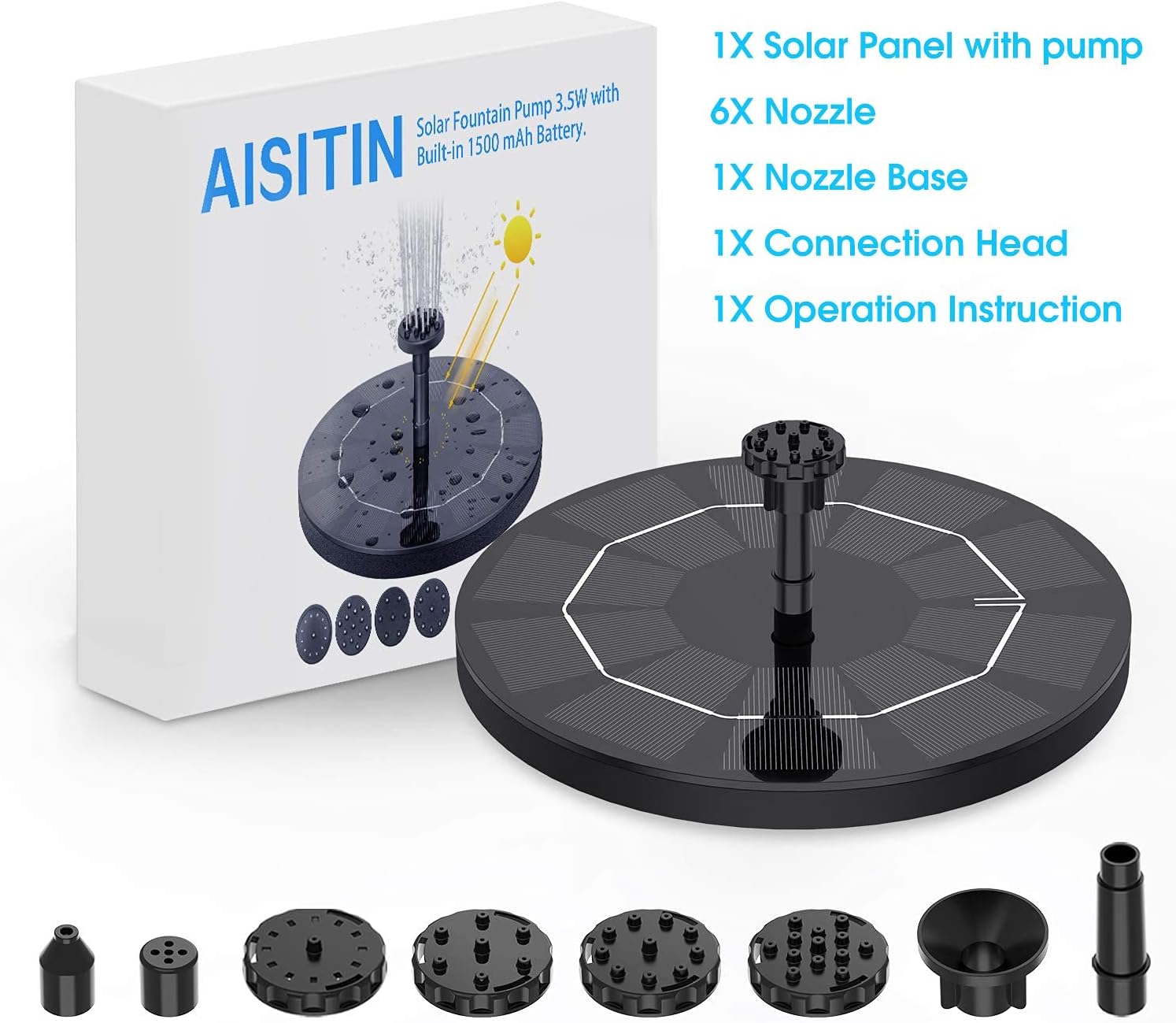 AISITIN Solar Fountain Pump 3.5W Circle Solar Water Pump Floating Fountain Built-in Battery, with 6 Nozzles,for Bird Bath,Fish Tank,Pond or Garden Decoration