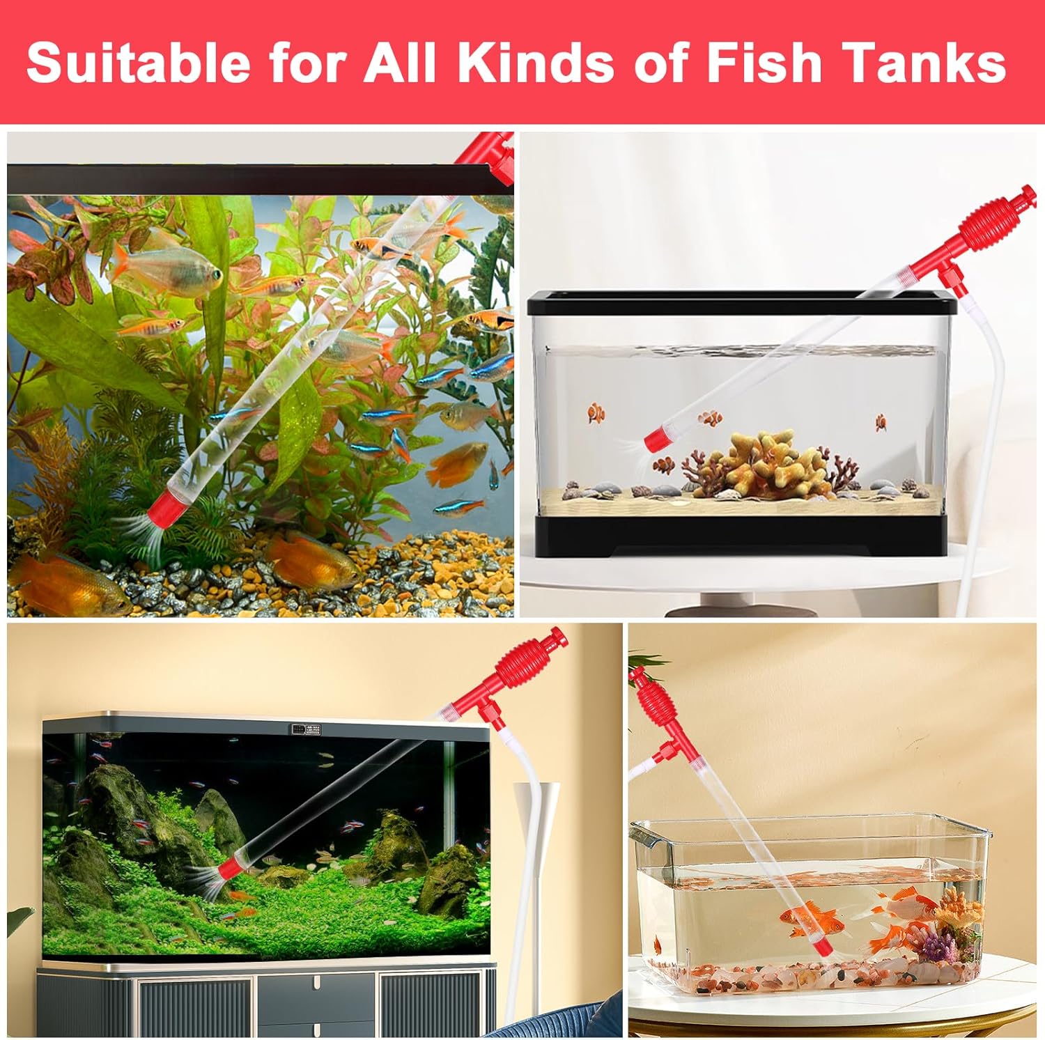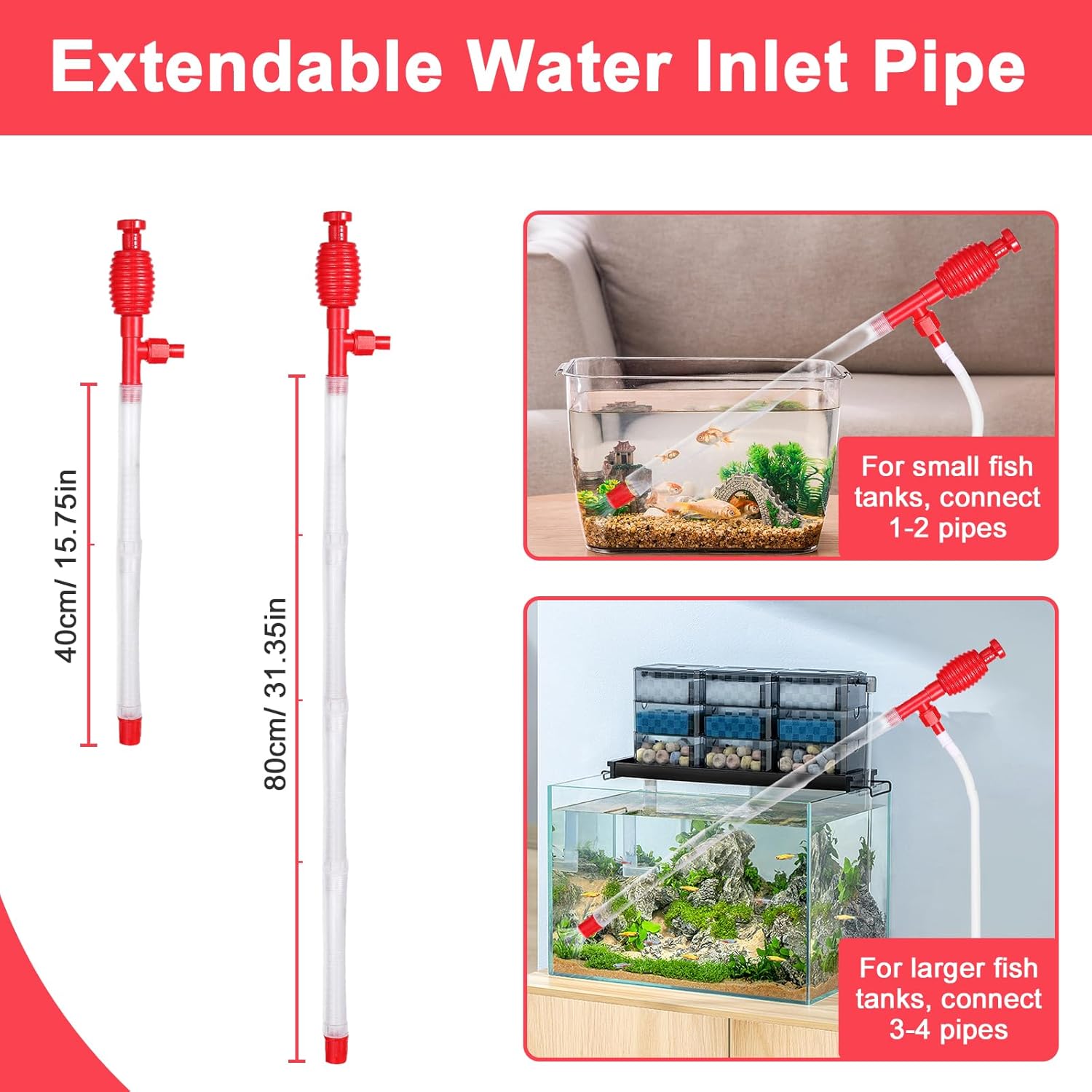🎣【Extended Design】Our aquarium fish tank syphon comes with 4pcs 8-inch inlet pipes and 1pcs 79-inch outlet pipe, offering greater reach and convenience. The extra-long pipe makes it easy to change water or clean gravel in larger tanks, ensuring that every part of your aquarium receives the care it deserves.