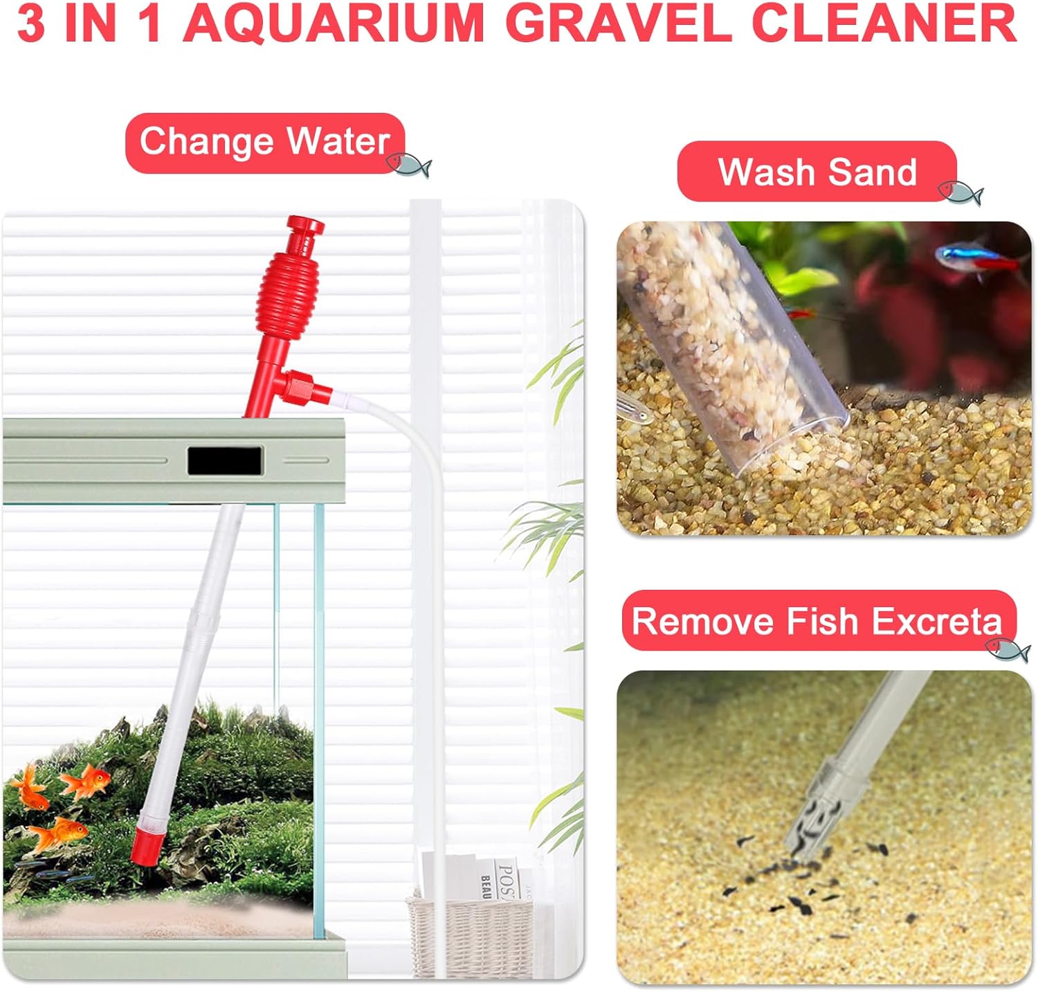 🎣【Multifunctional Fish Tank Cleaner】This fish tank gravel cleaner combines water change, sand washing and dirt absorption capabilities to meet your various needs. It can easily and quickly suck out muddy water, leftover food, and fish feces from the fish tank to keep the water clean and fresh.