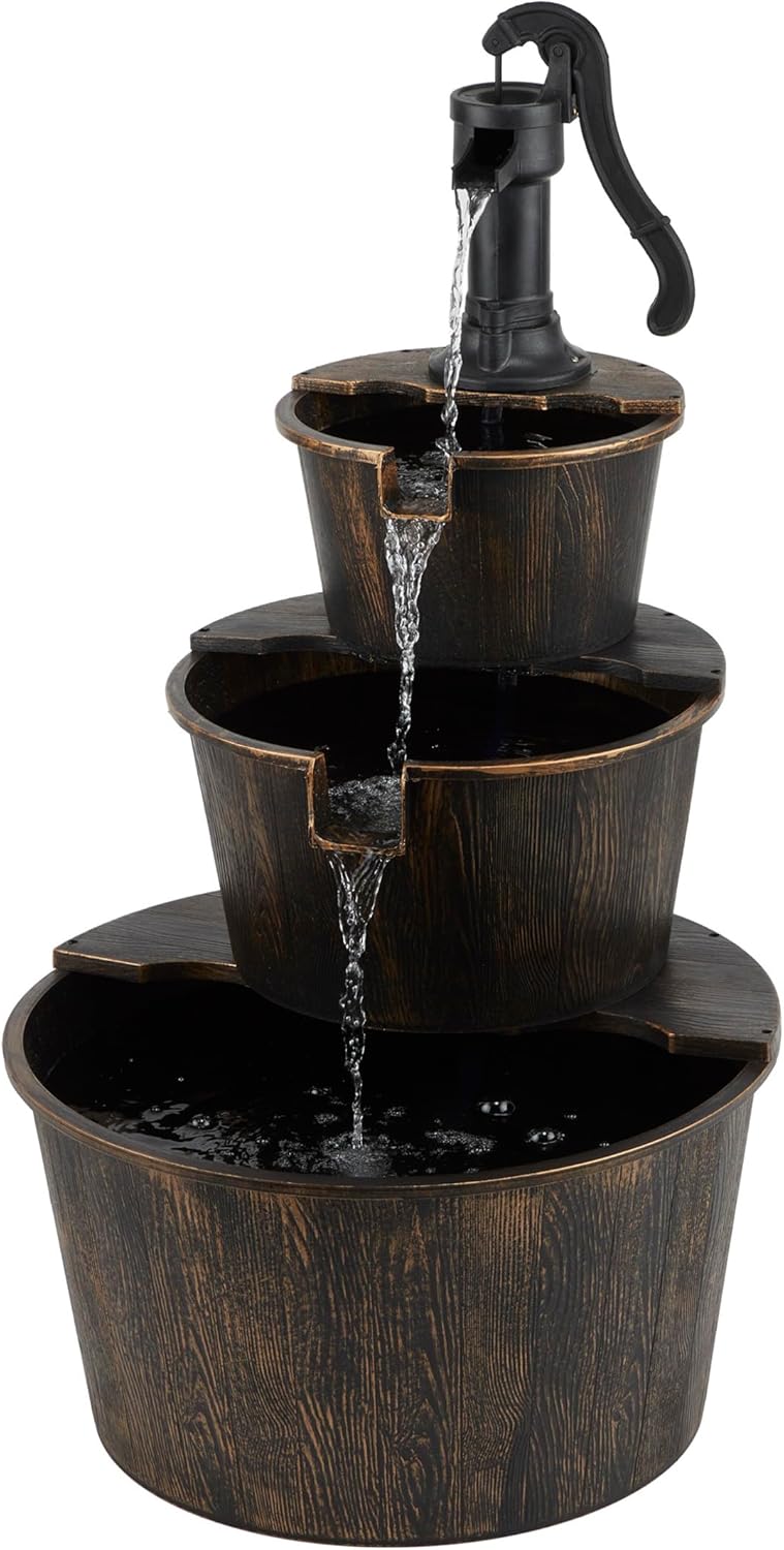 RELAXING WATER FLOW: Water trickles from the pump spout into the barrel tiers, adding a peaceful ambiance to your outdoor setting