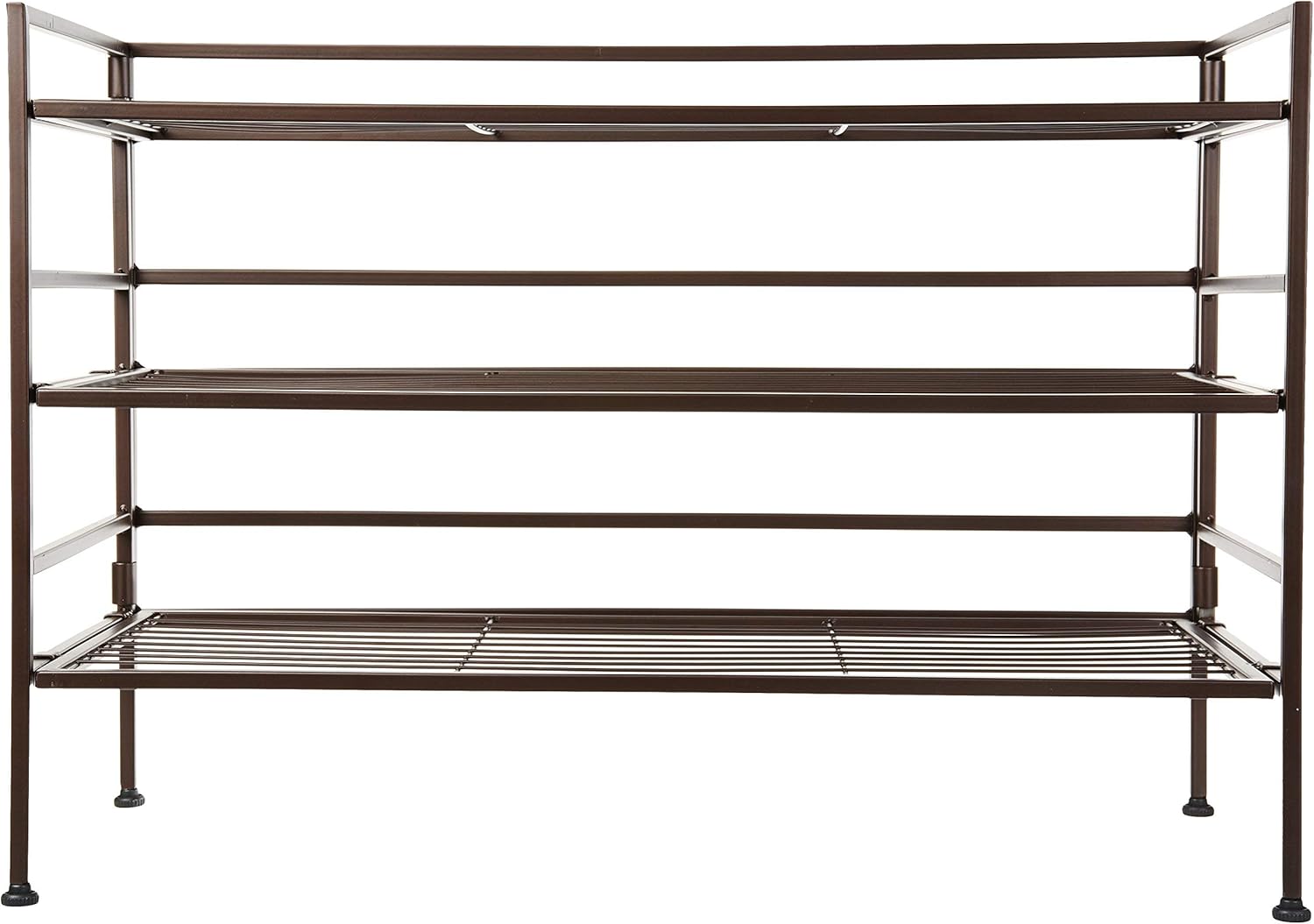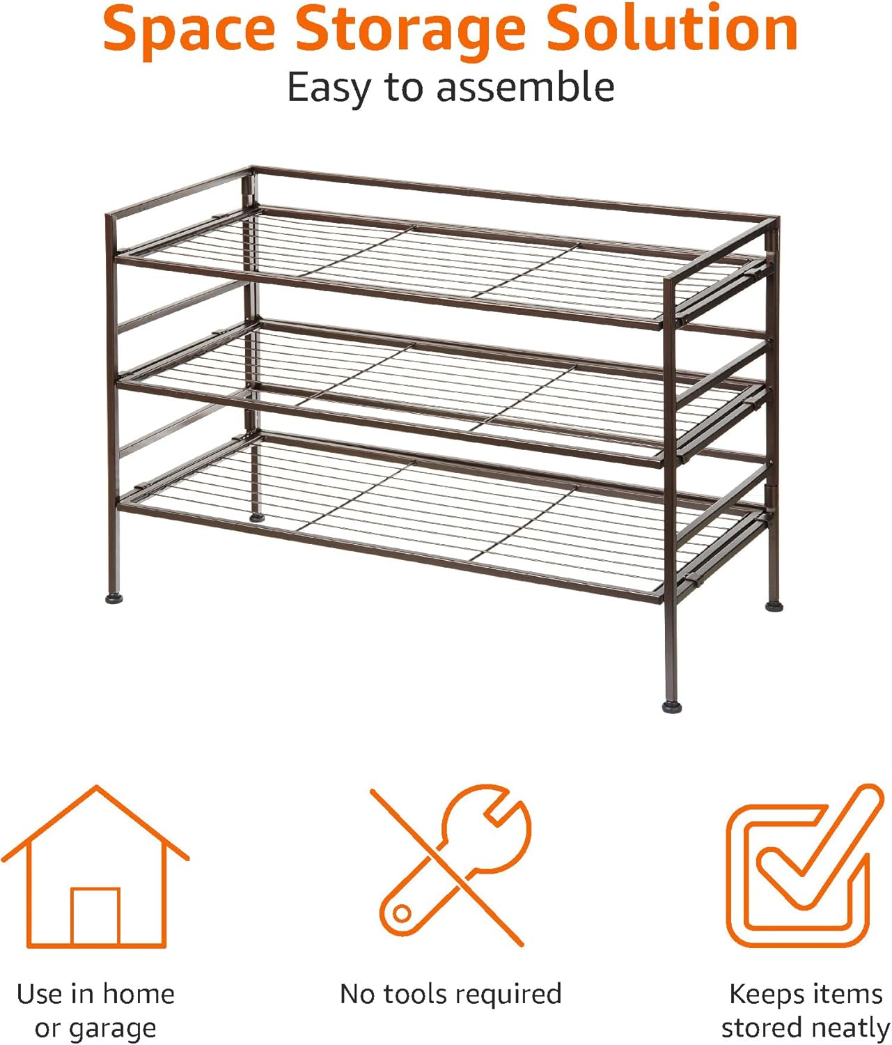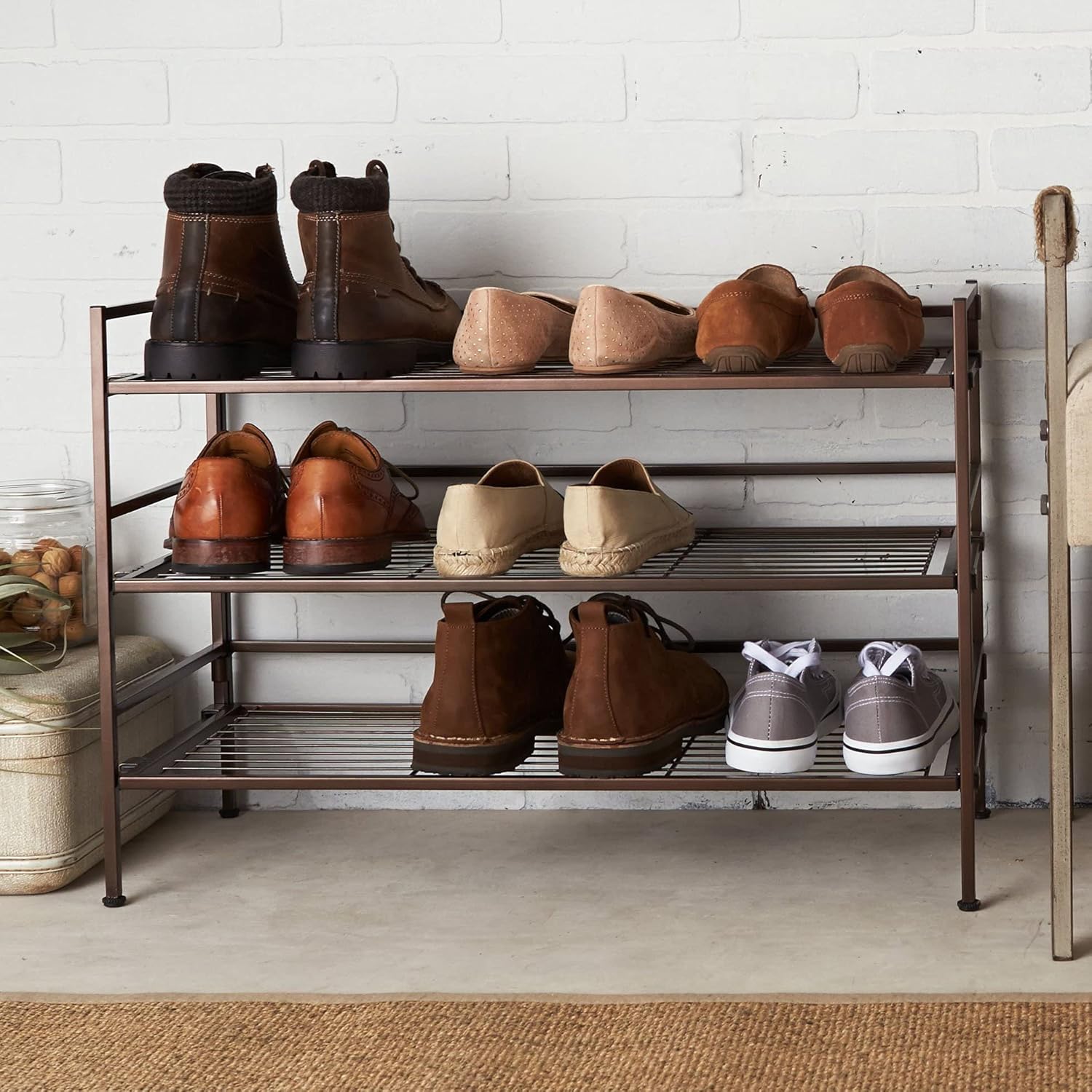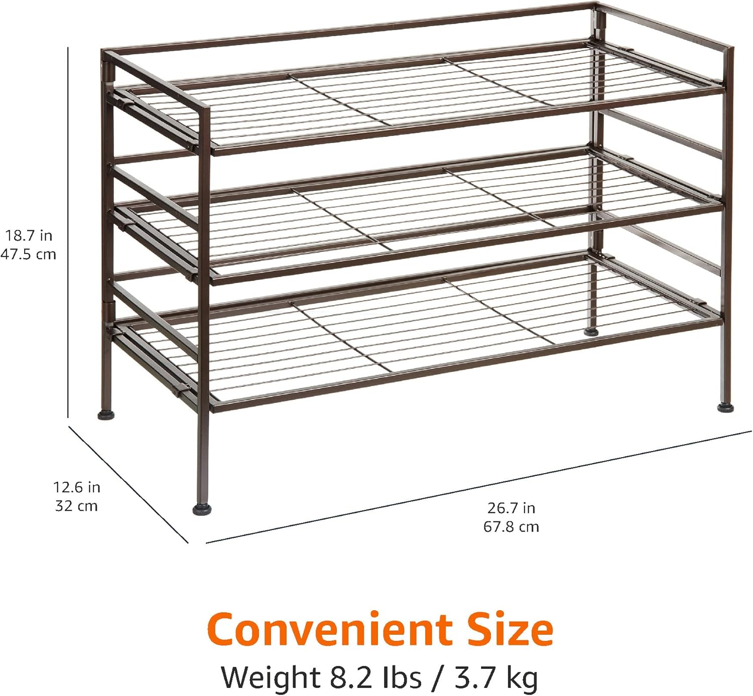Neatly store up to nine pairs of shoes with this Amazon Basics shoe rack. Each shelf of the three-shelf unit holds up to three full-size pairs of shoes. Ideal for use in any closet or in a front entrance, hallway, or dorm room, the three-tiered vertical shoe rack makes it easy to reclaim valuable floor space – and more convenient access to your shoe collection. From work shoes to running shoes, slip-ons, or sneakers, the Amazon Basics nine-pair shoe rack keeps shoes uncluttered and orderly – no more shoes spilling out of a closet or piling up by the door.