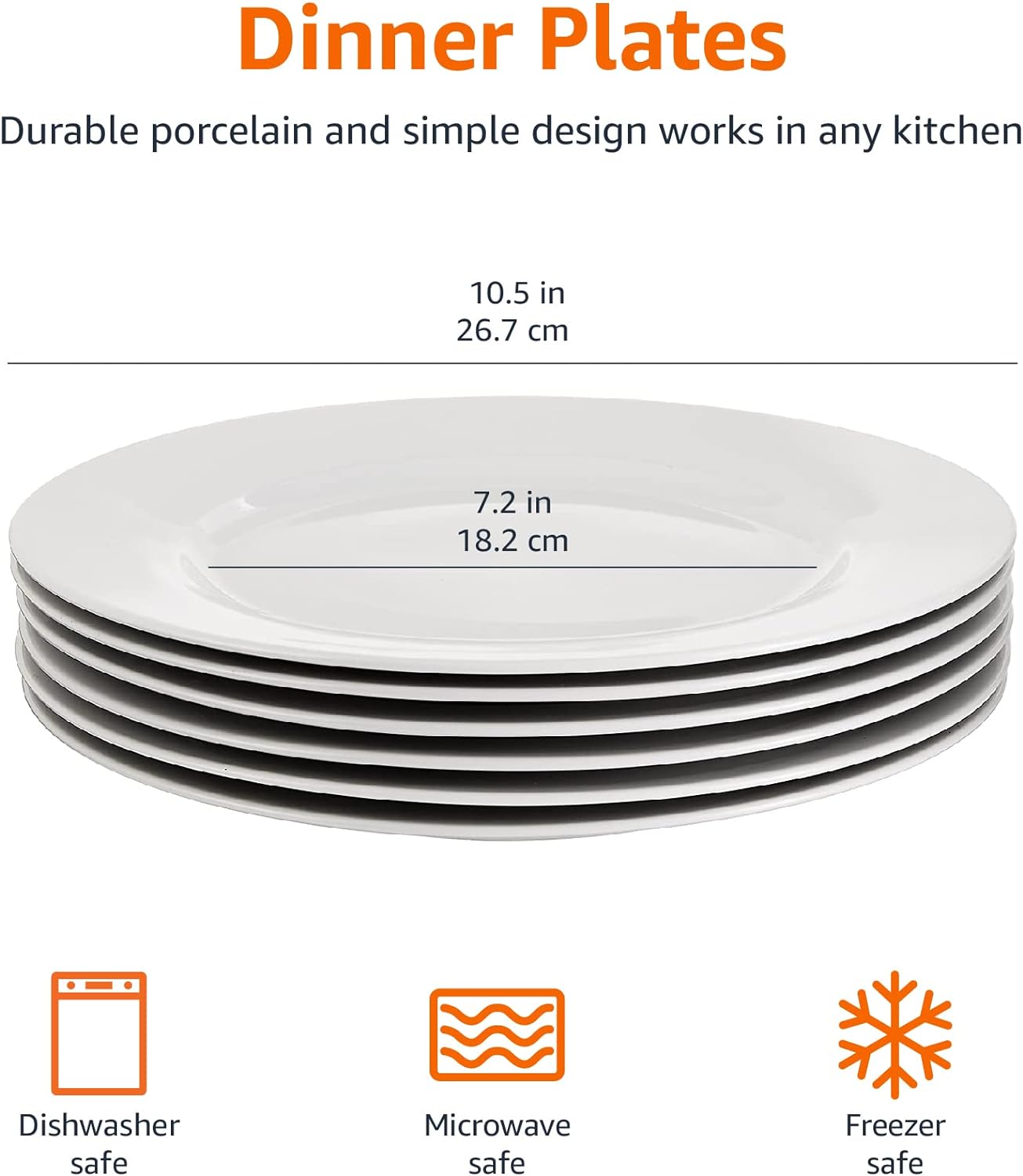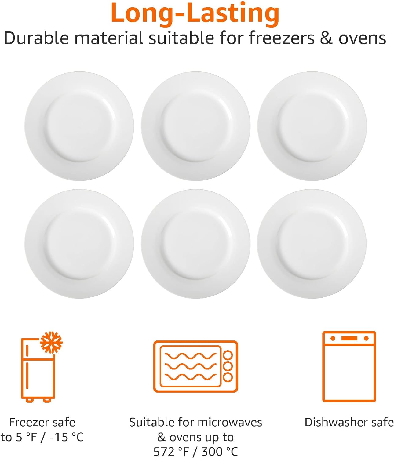Detail AB-grade porcelain; BPA-free; lightweight yet durable Elegant white finish Safe in your microwave, oven, freezer, and dishwasher Includes six 26.5 cm dinner plates Plates can withstand temperatures between 300 and -15 degrees (Celsius)