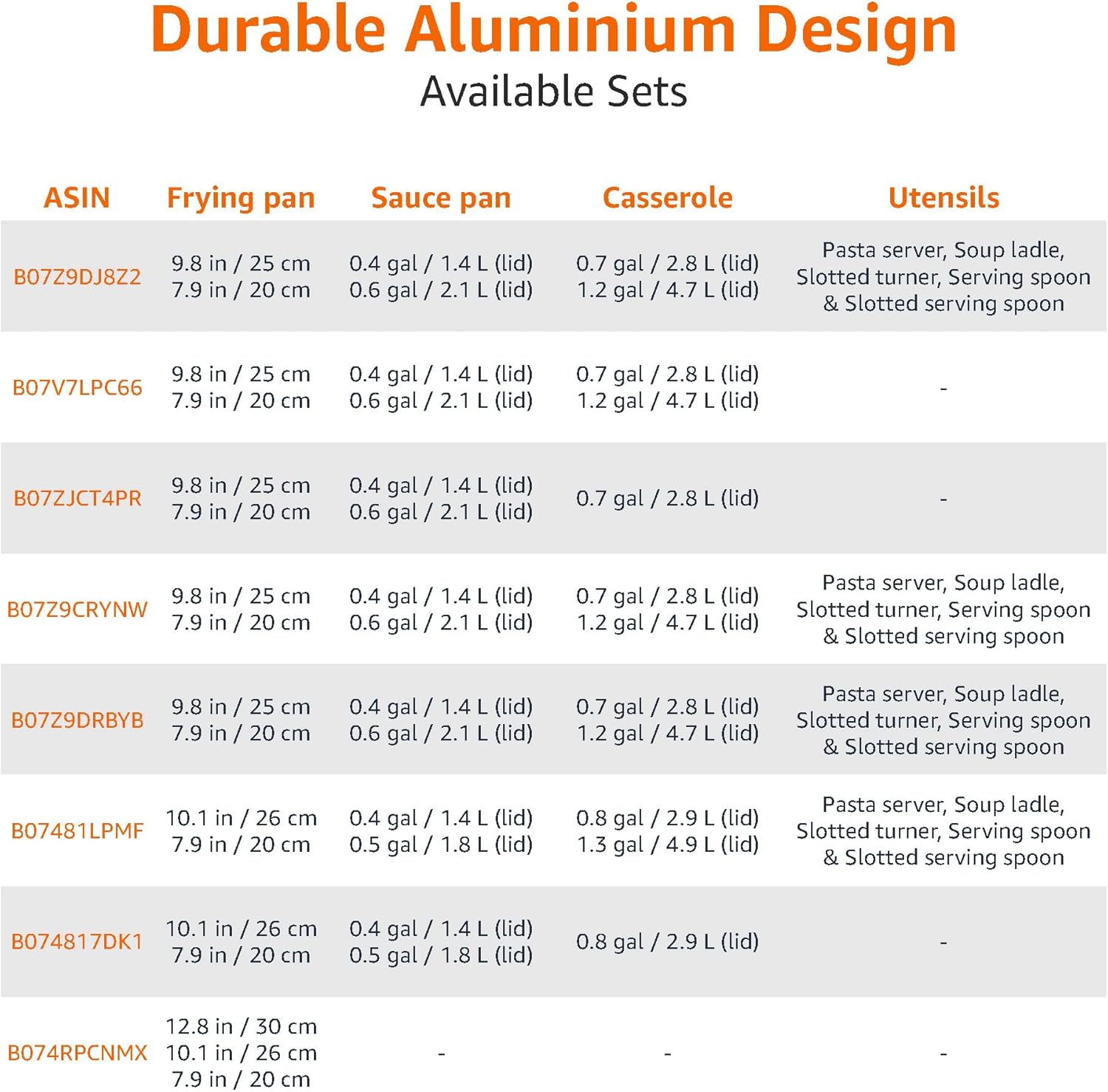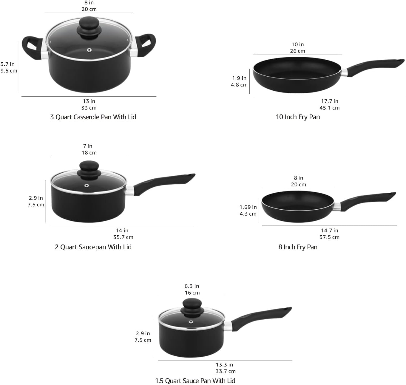 8-piece nonstick cookware set includes 20 cm fry pan, 25 cm fry pan, 1.41 L sauce pan with lid, 2.12 L sauce pan with lid, and 2.83 L casserole pan with lid