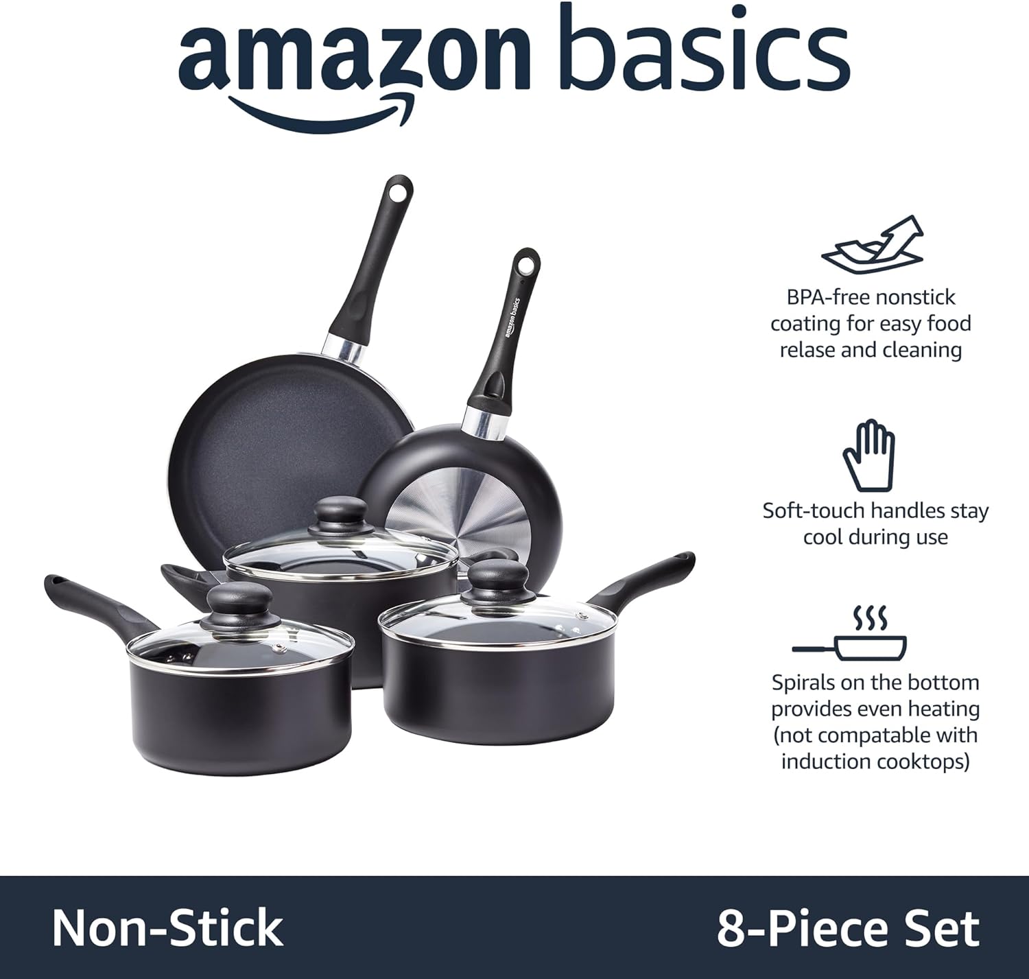 Amazon Basics 8-Piece Non-Stick Cookware Set, Black