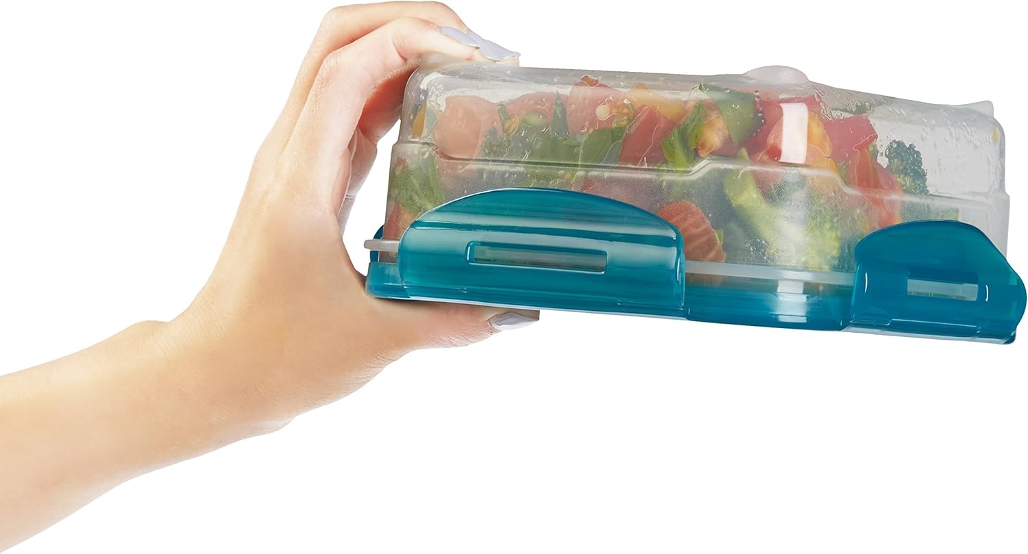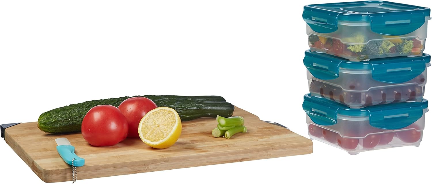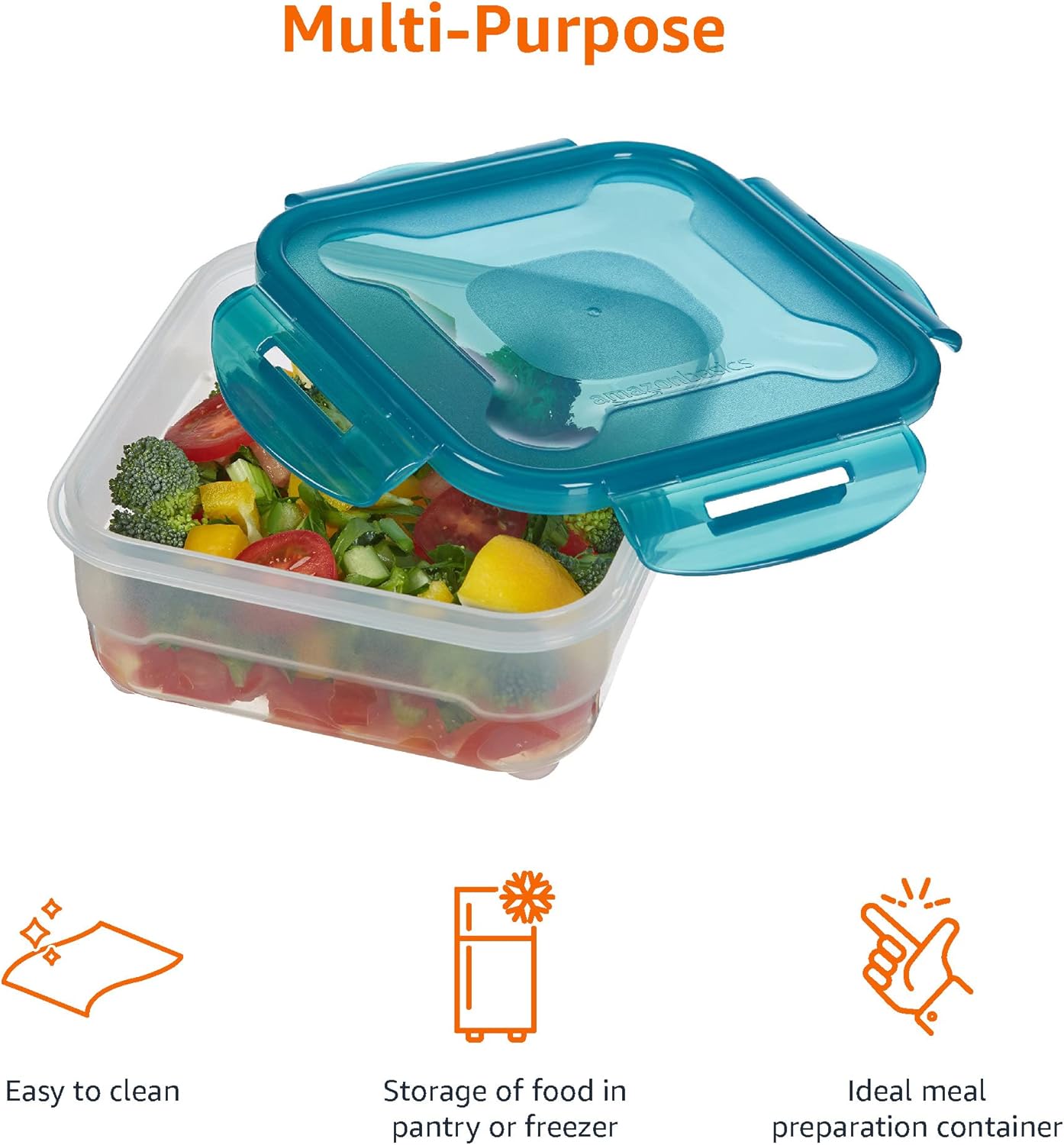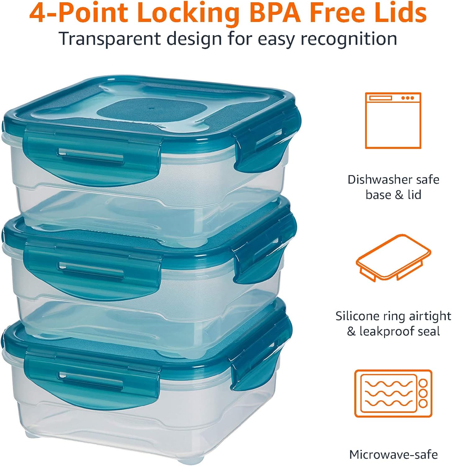 Airtight and spill proof, this set of AmazonBasics food-storage containers with secure-fitting lids keep wet or dry food stored, neatly organized, and fresh for longer, helping to retain flavour and reduce waste. Each matching lid features four snap-down latches and a special silicone seal in the rim to ensure perfect, secure closures and reliable, leak-free performance.