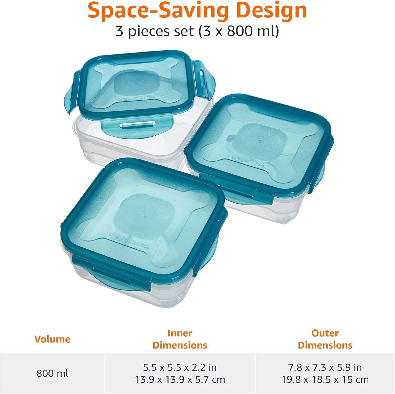 Amazon Basics Air-Locked Leak-Proof, Stackable & Airtight Fridge/Freezer Containers with Lids, BPA-Free Plastic, Microwave and Dishwasher Safe 3-Piece Food-Storage Set, 3 x 0.8 Liter, Clear