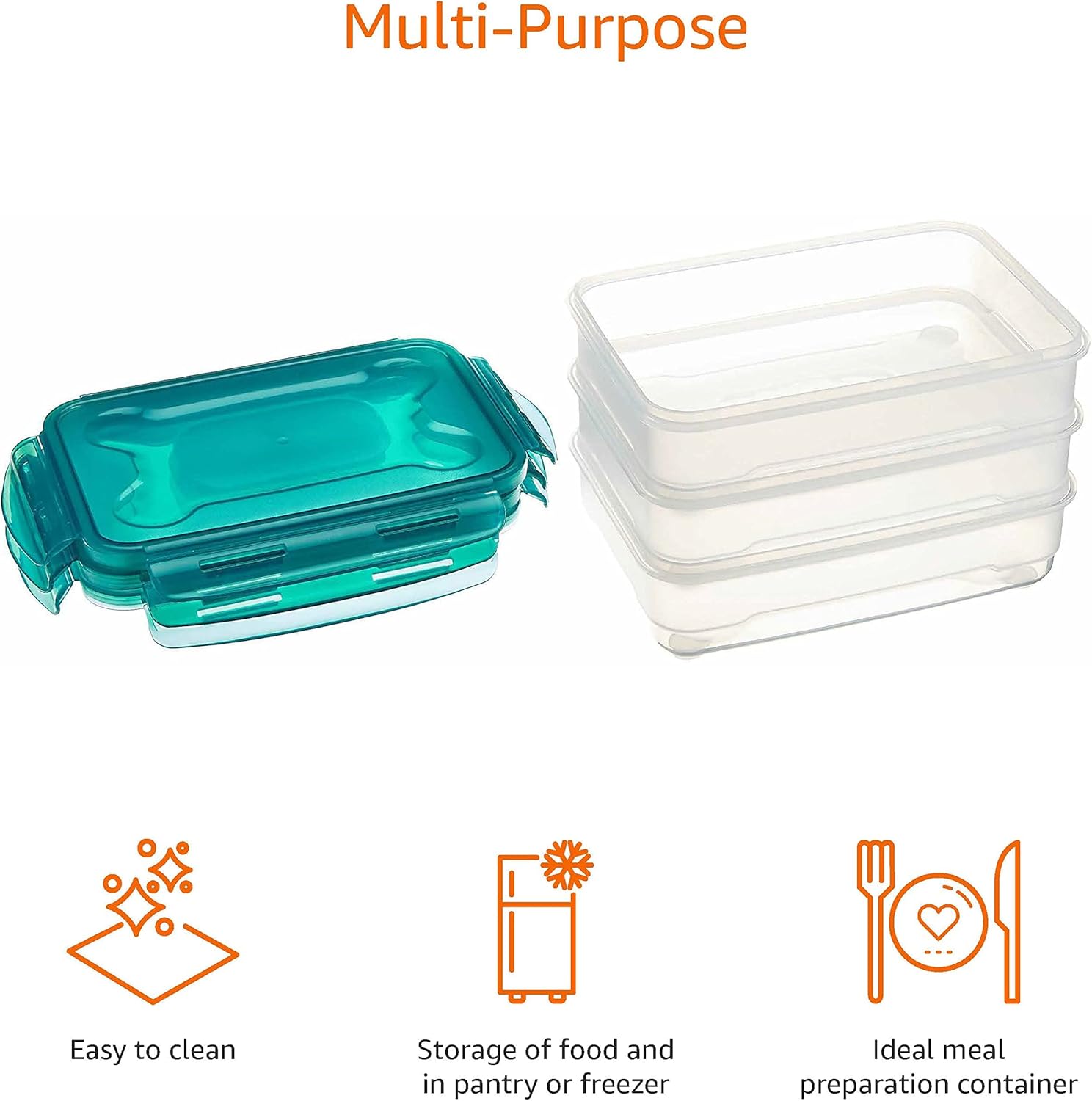 Airtight and spill proof, this set of Amazon Basics food-storage containers with secure-fitting lids keep wet or dry food stored, neatly organized, and fresh for longer, helping to retain flavour and reduce waste. Each matching lid features four snap-down latches and a special silicone seal in the rim to ensure perfect, secure closures and reliable, leak-free performance.