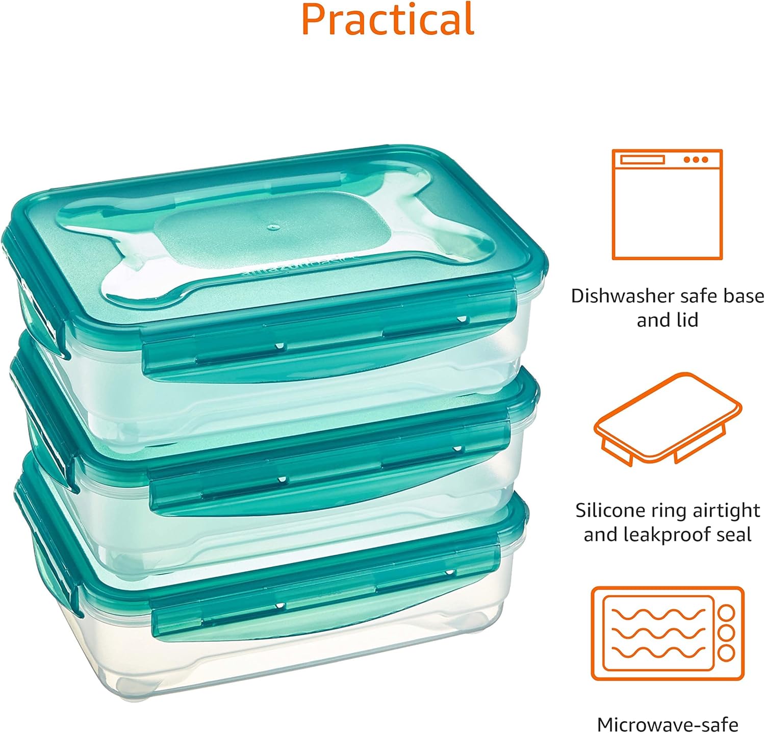 Amazon Basics Air-Locked Leak-Proof, Stackable & Airtight Fridge/Freezer Containers with Lids, BPA-Free Plastic, Microwave and Dishwasher Safe 3-Piece Food-Storage Set, 3 x 1.2 Liter, Clear