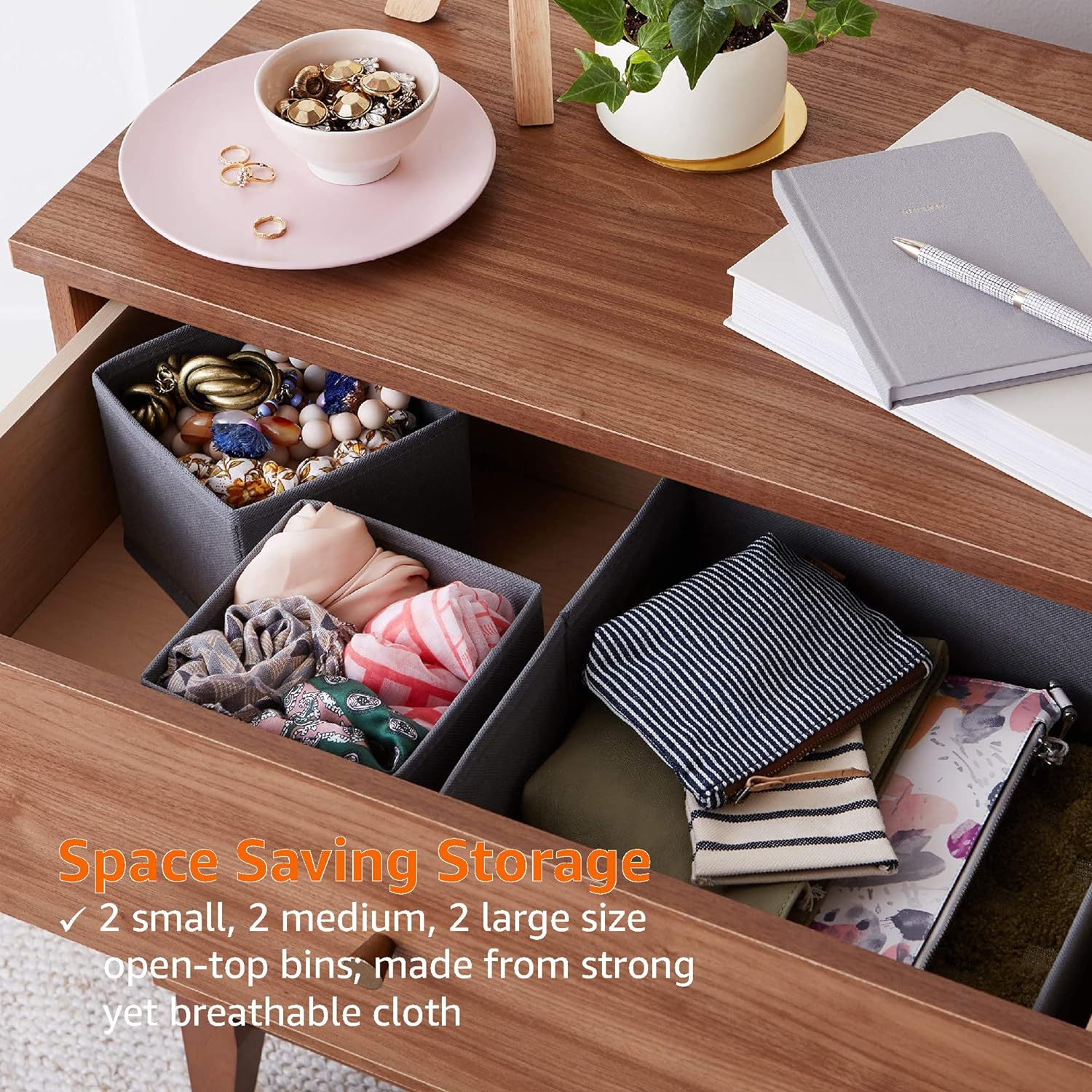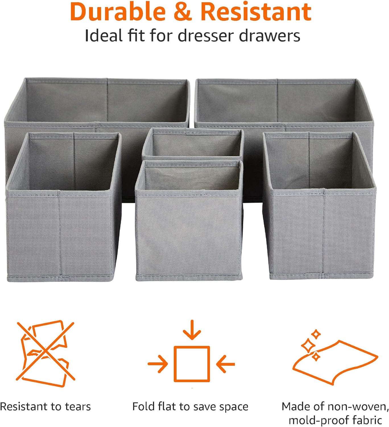 Set of 6 Collapsible Drawer Dividers: Includes 2x small, 2x medium, and 2x large size open-top bins; made from strong yet breathable cloth