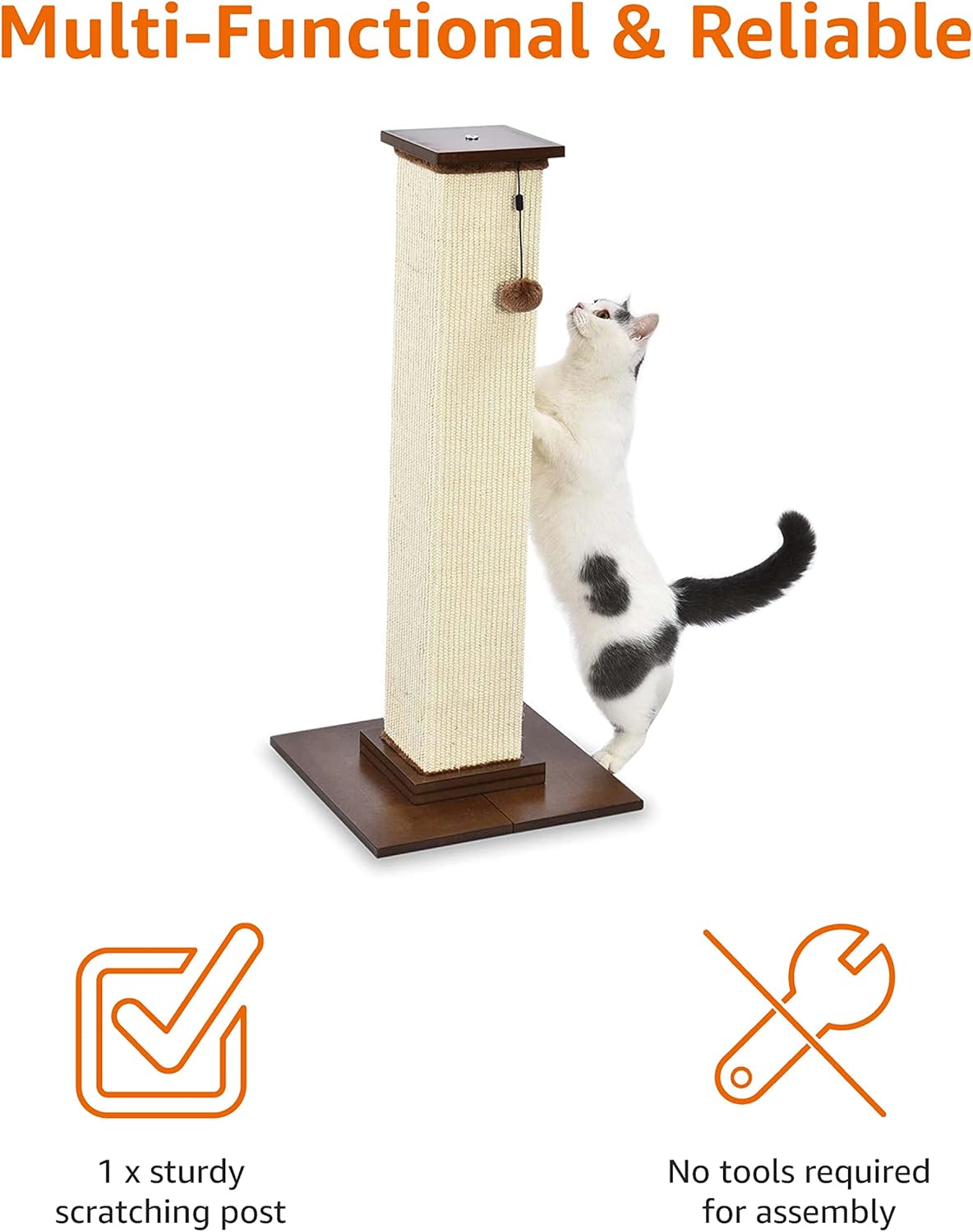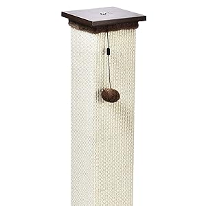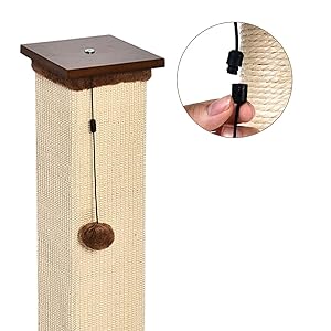 Scratching post for cats with wood base Includes attached pom pom toy for play Satisfies your cat’s urge to scratch Scratchable pillars made with natural, durable jute rope Rough texture contributes to healthy nails