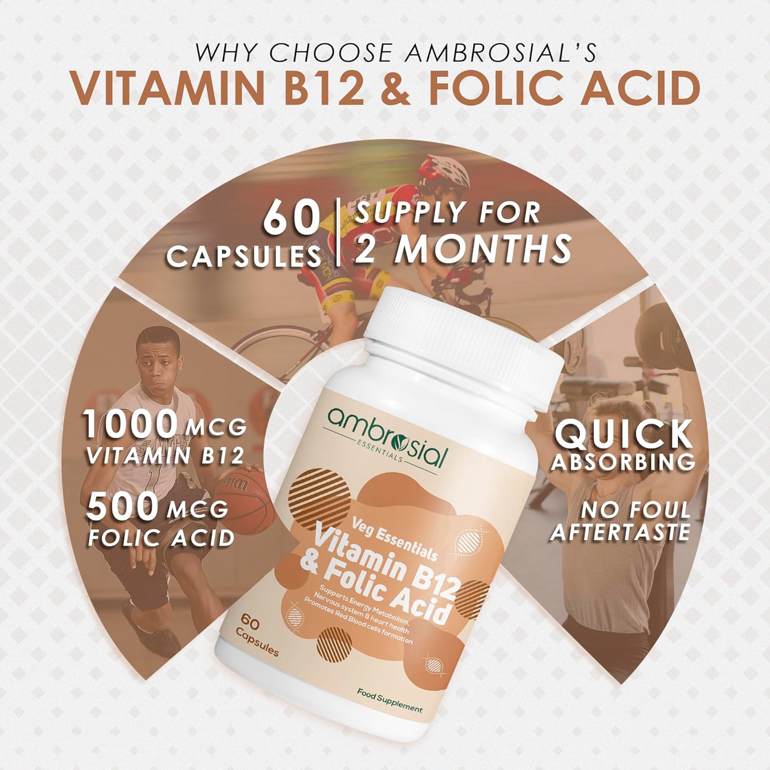 Ambrosial Vitamin B12 1000 mcg + 500 mcg Folic Acid | 1500 mcg | Folic Acid | Reduction of Tiredness & Fatigue | B12 Supplement | Immune System, Energy & Brain Support (Pack of 2-120 Capsules)